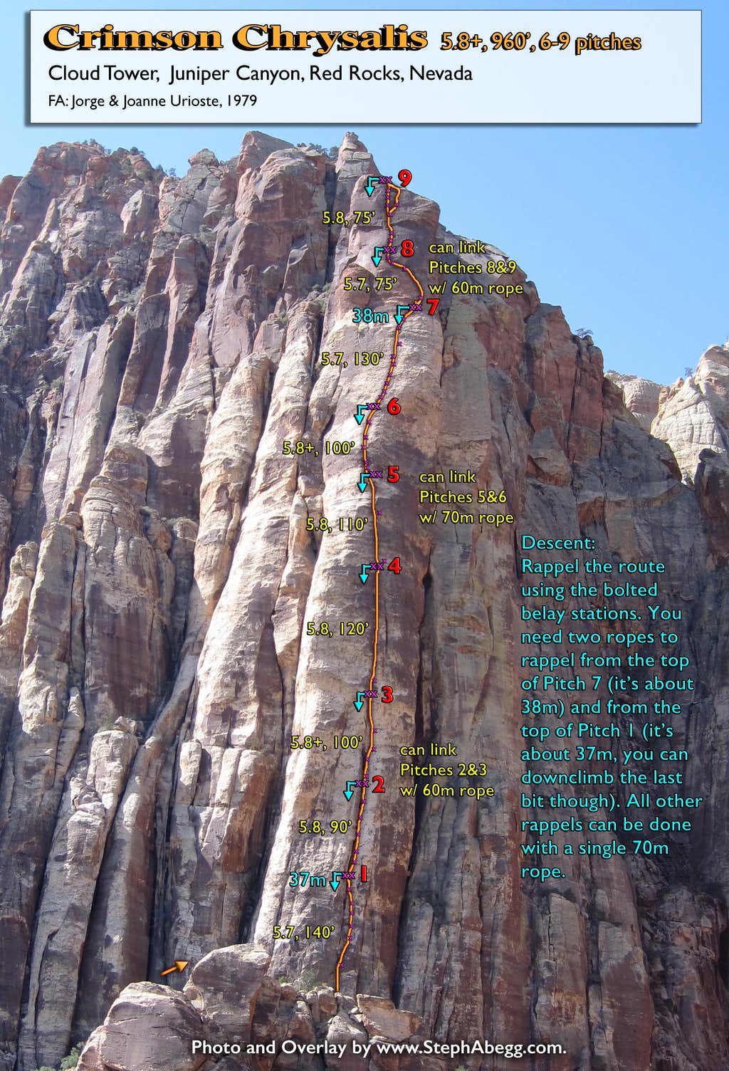 1. Crimson Chrysalis is on Cloud Tower, just left of center in the photo on the north side of the East Peak of Rainbow Mountain. Juniper Peak is on the right. 2. Looking up the route from the base. Basically follow the crack system up the center of the tower. This crack eventually ends in face but the route still just goes up the middle of the tower. 3. Sarah leading Pitch 1. The standard route climbs a bolted face to the right of the crack. 4. There are lots of bolts on this route. 5. Looking up Pitch 2, which we linked with Pitch 3 for a long 200+ foot pitch. 6. Sarah nearing the top of Pitch 3. This is fun 5.8 climbing. 7. Sarah leading up Pitch 4. This pitch was about 120 feet, shorter than was noted in the topo. 8. Looking up Pitch 5, which starts with a fun hand to finger crack. We linked this with Pitch 6 for a long 200+ foot pitch. This was probably my favorite section of the route. 9. Sarah nearing the top of Pitch 6. Steep face climbing on juggy holds with great exposure. 10. Sarah leading off Pitch 7. 11. Sarah leading off Pitch 8, which we linked with Pitch 9. More steep face climbing on juggy holds with great exposure. 12. Looking up Pitch 9. In the photo Sarah is waving from the top of the tower. We did the direct finish, which goes directly up the steep chocolate rock to the top. There are enough features that it maintains the 5.8+ rating of the route. 13. Steph nearing the top of Pitch 9. Photo by Sarah Inwood. 14. View from the top of Cloud Tower. 15. Sarah on top of Cloud Tower. This is the best belay spot on the route. 16. Steph on top of Cloud Tower. Photo by Sarah Inwood. 17. Rainbow Wall to the west. This wall is the location of most of the big wall routes in Red Rocks. 18. The Nightcrawler goes up the right side of this pillar on Brownstone Wall. About a week later I climbed this awesome route! 19. Watch out for the cacti on the trail! |