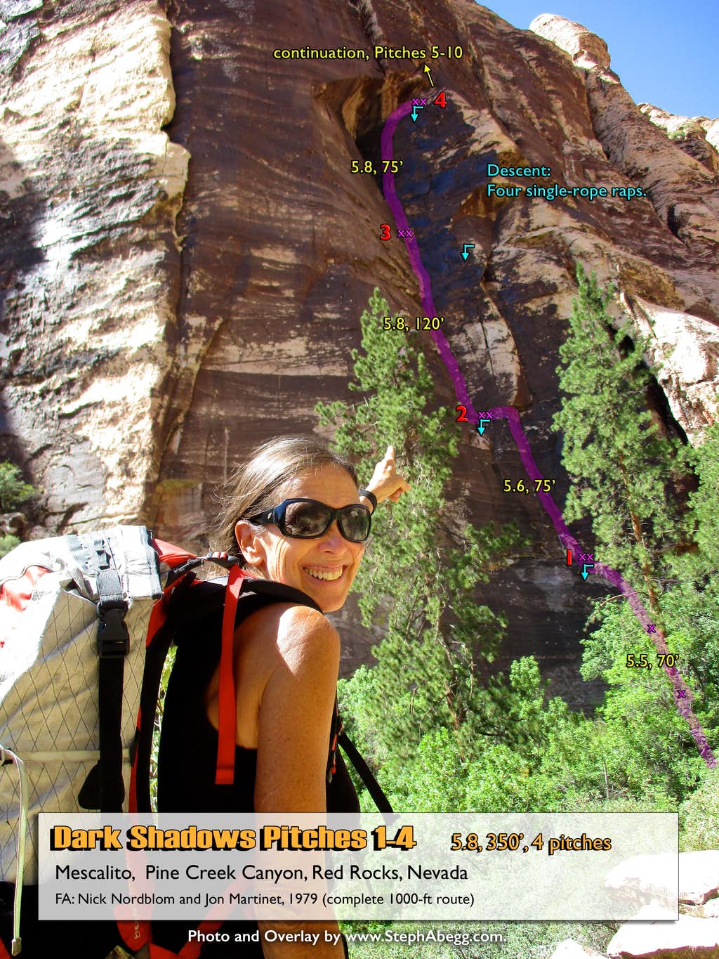 1. Dark Shadows starts in the dark, shadowed corner on the right side of Mescalito. 2. Joanne pointing out the route line of Dark Shadows. 3. There is an idyllic stream and pool running right below the base of the route. Just try not to get the rope wet! (Kudos to those who can keep the rope dry on the final rappel and rope pull!). 4. Joanne on Pitch 1, which climbs a 5.5 face to a bolt anchor. There are a couple of bolts for protection. 5. Joanne leading off Pitch 2, which climbs a 5.6 corner. 6. Taken while climbing the 5.6 of Pitch 2. 7. A mangled cam on Pitch 2. Someone really wanted to get this out. 8. Looking up Pitch 3. This is probably the best pitch of the route, and climbs the corner on glassy black rock broken by just enough cracks and huecos to make the climbing 5.8. The climbing on this pitch is quite unique and aesthetic, not to mention incredibly fun. 9. Joanne climbing up Pitch 3, as seen from the belay at the top of the pitch. 10. Joanne a bit higher up on Pitch 3, having fun. How could you not have fun on this route?! 11. Looking up Pitch 4, which climbs the crack on the face to an anchor below the roof. 5.8. 12. Looking down at Joanne at the belay while climbing Pitch 4. 13. Joanne on the crux 5.8 pod exit move on Pitch 4. If climbing only through Pitch 4, it's probably best to set the final anchor where I am in the photo rather than the one a bit higher and right (it makes the rope pull after the rappel easier). 14. Looking down Pitch 4 of Edge Dressing, which is a 10b face pitch. We toproped this on the first rappel from Dark Shadows. 15. Looking up Pitch 3 of Chasing Shadows, which is a 5.8+ crack pitch. We toproped this on the second rappel from Dark Shadows. 16. "Red spots in the Aztec Sandstone are iron concretions, where subsurface water has precipitated iron oxide around a nucleus in the sandstone. These concretions are more resistant to erosion than the surrounding sandstone, and weather into little balls known as Indian or Moqui Marbles." Reference. |