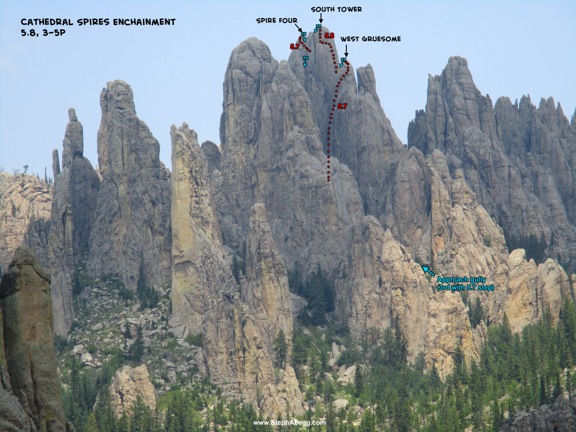 To start off our 2-week climbing road trip to Wyoming, Nate and I decided to check out the Needles. We arrived mid-day, and after getting situated at the campground, we spent the afternoon doing the Cathedral Enchainment, which is a great linkup with nearly 400 feet of 5.7 climbing and three wild summits. The routes we took to get to the three summits were all FAs in the 1940s by climbing pioneers Herb and Jan Conn. The enchainment traverses up the Spire 4 ridge line, starting with West Gruesome, then up and over South Tower, and to the top of Spire 4, the highest summit of the Cathedral Spires.