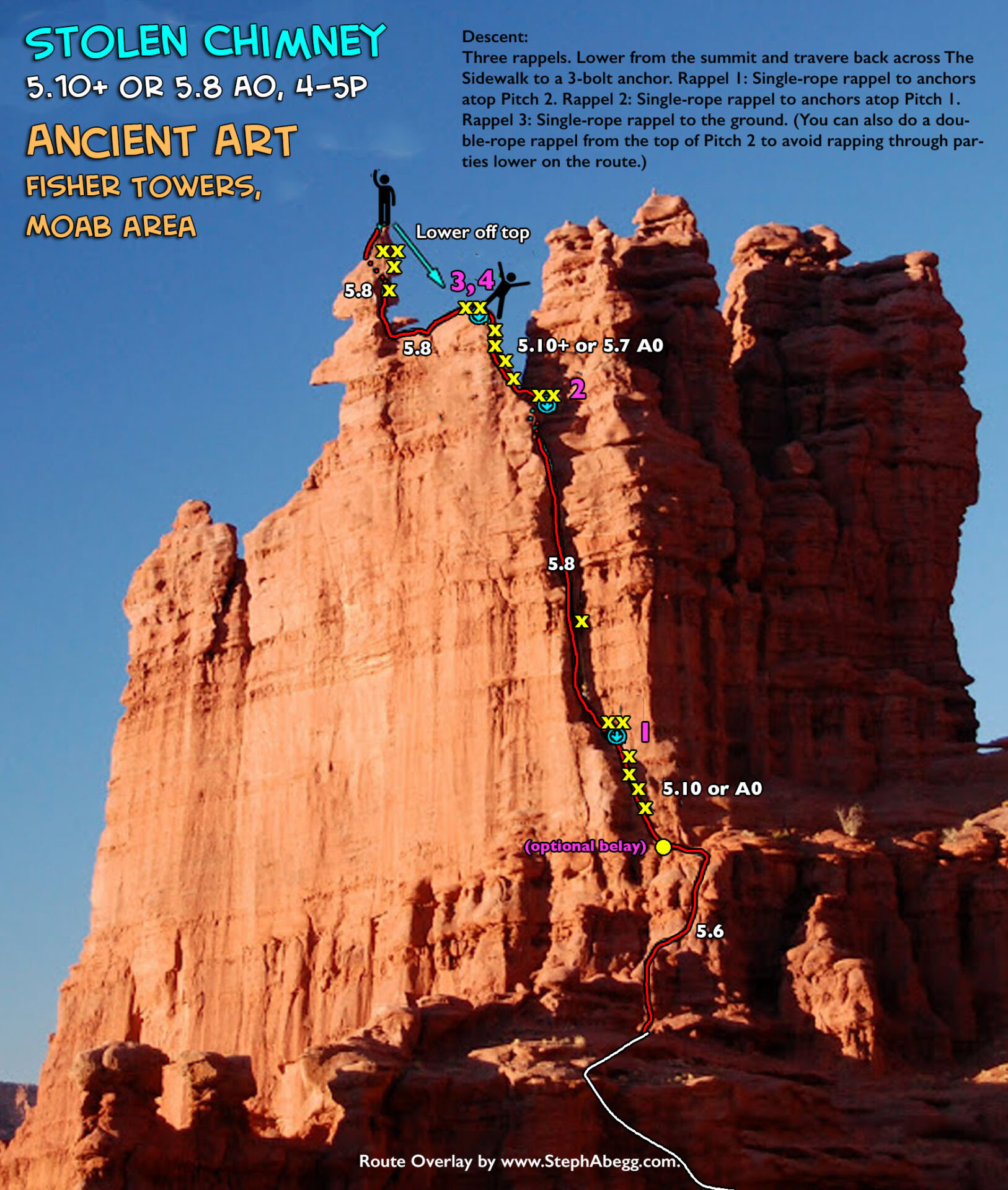 Ancient Art, the first major formation encountered on the trail to the main Fisher Towers area, is a grotesque three-summited tower. The classic Stolen Chimney Route ascends the south side of the tower. Interesting climbing, good protection, some mud and choss, and lots of exposure.