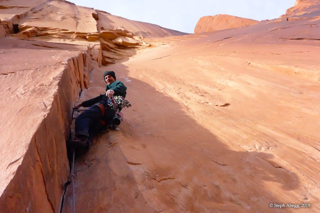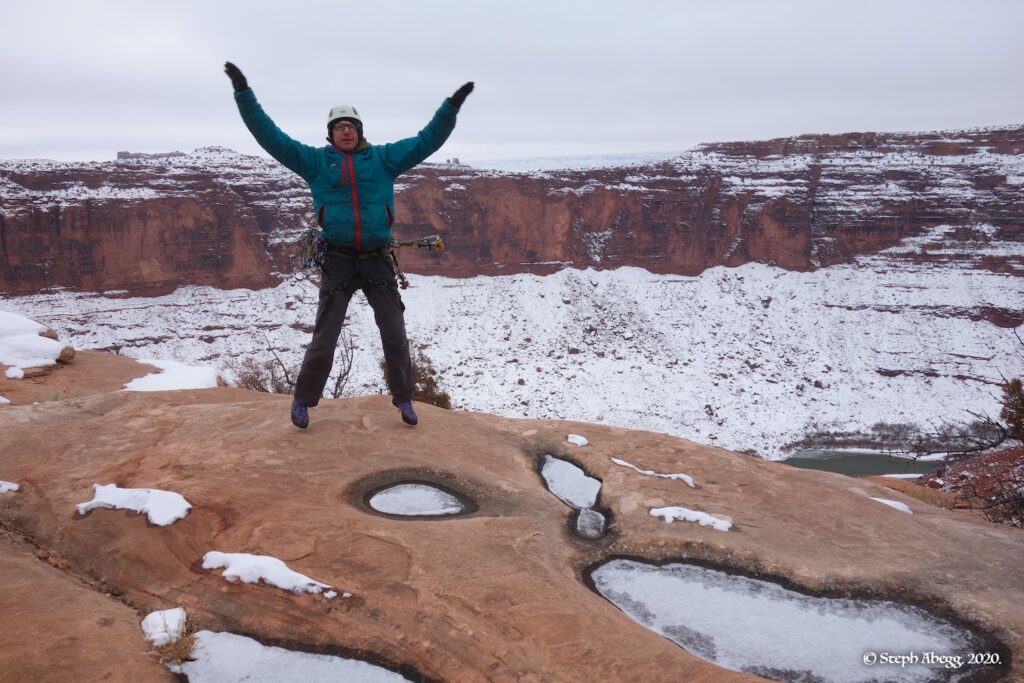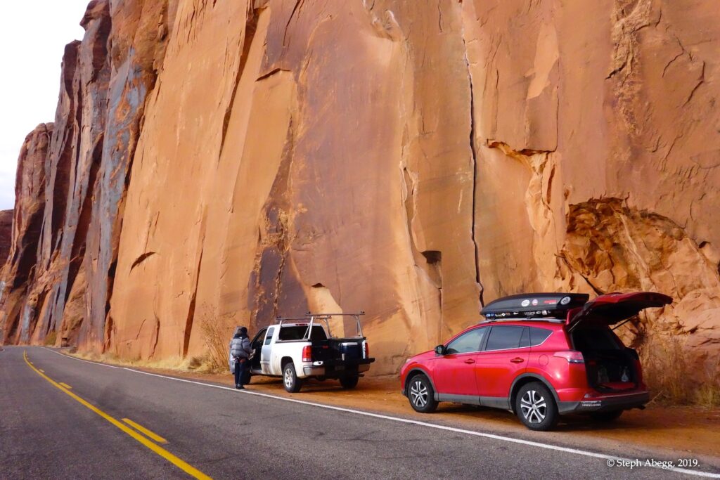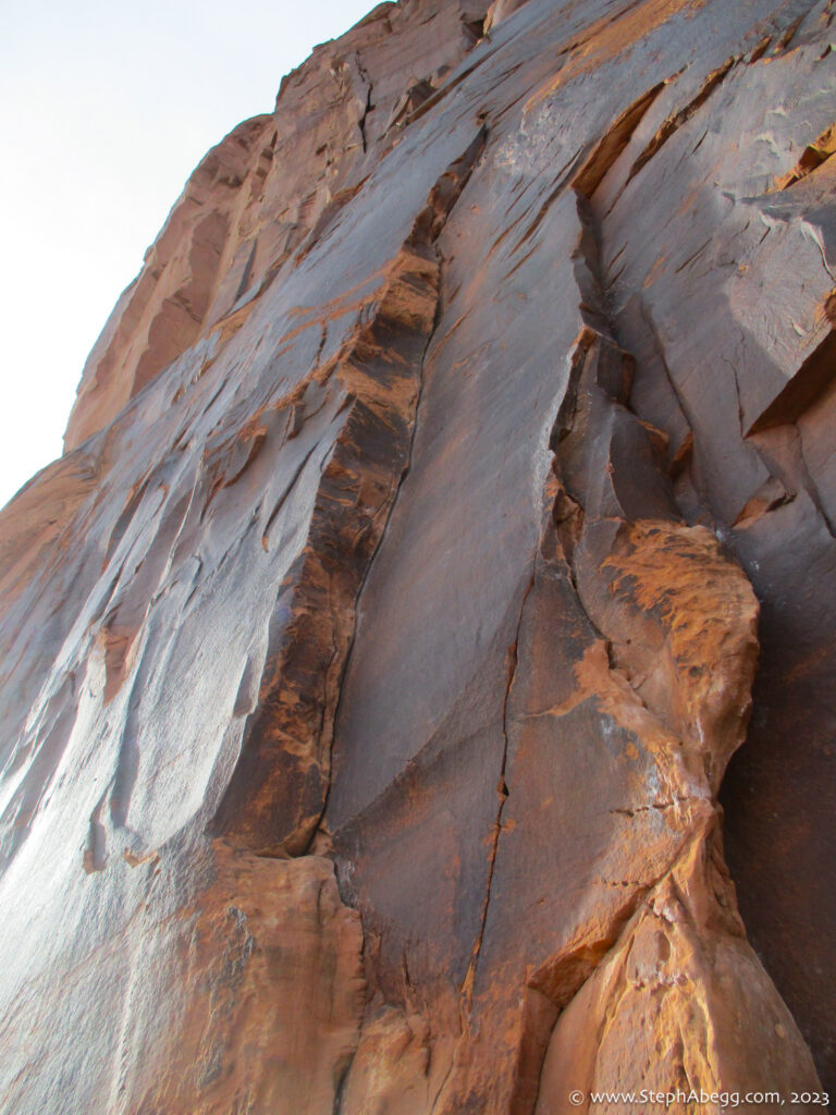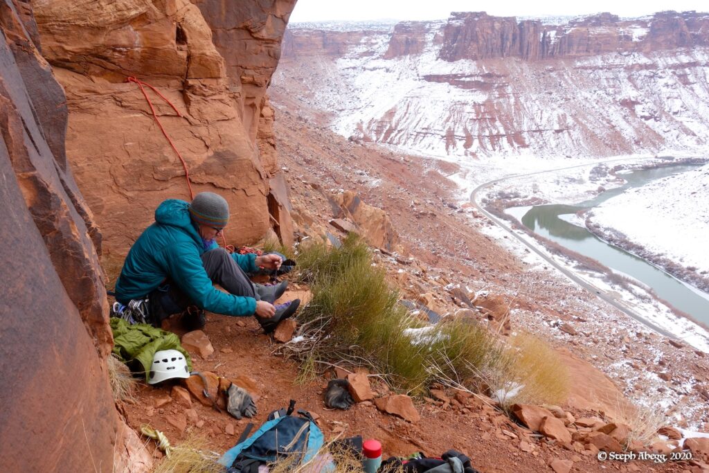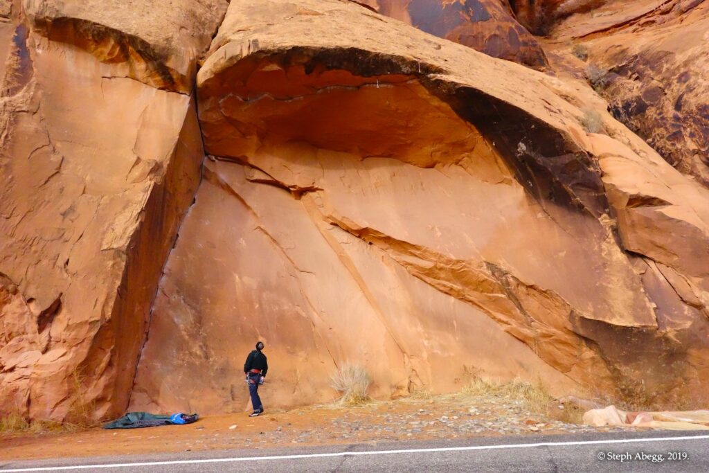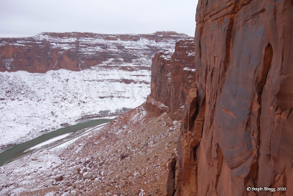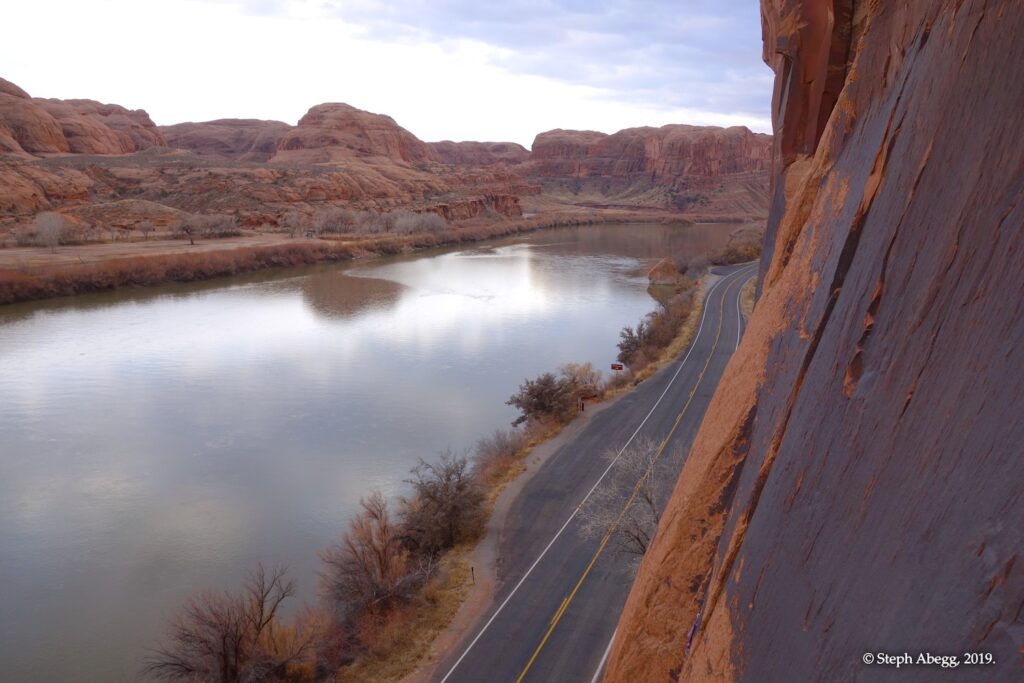Indian Creek, where we planned to spend the rest of Thanksgiving week. However, an unforecasted snowstorm deposited 5 inches of snow on us after our first day. So we drove back to Moab and cragged a day at Wall Street while we waited for the snow to melt in Indian Creek. Wall Street is a popular cragging area near Moab. And for good reason. The 500-foot cliff of Navajo sandstone towers above the Colorado River and UT 279, and there are more than 100 routes, both bolted face and cracks, ranging in difficulty from 5.4 to 5.12. With its sunny aspect, Wall Street is a great place to spend a cool day.