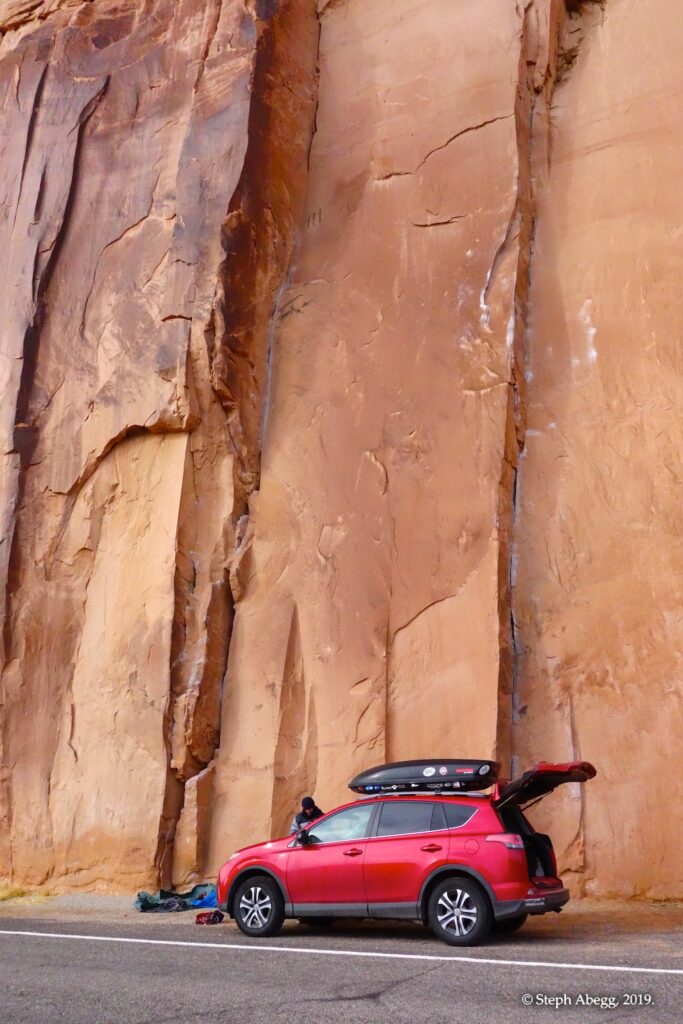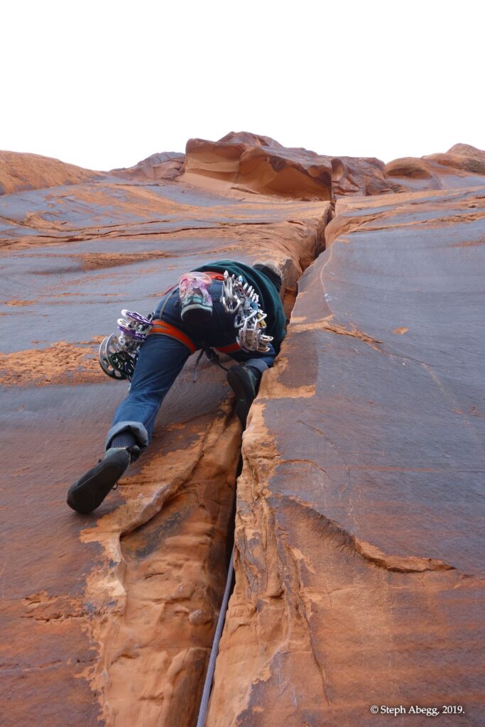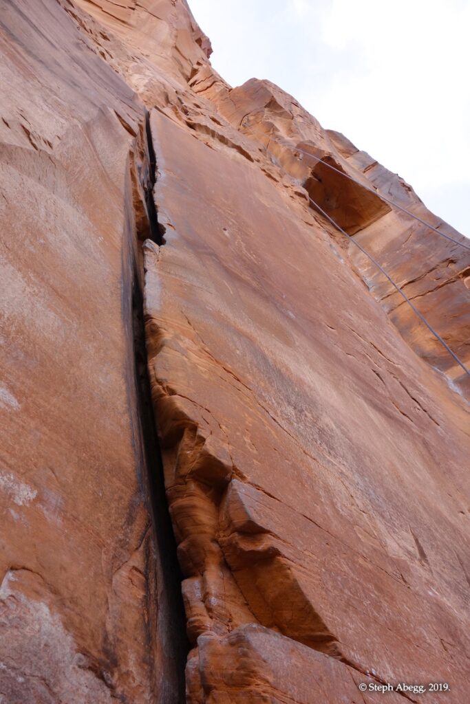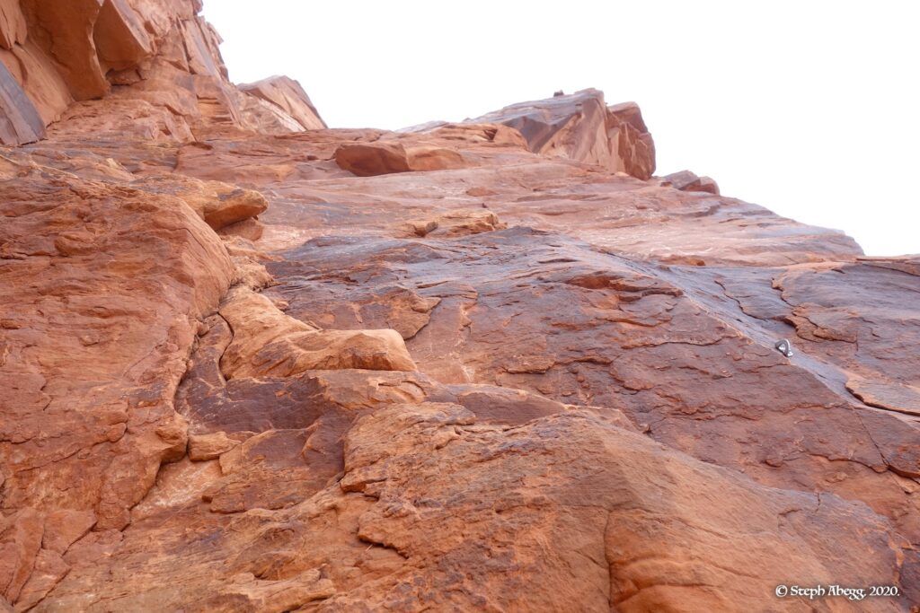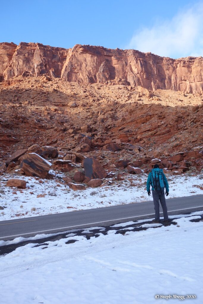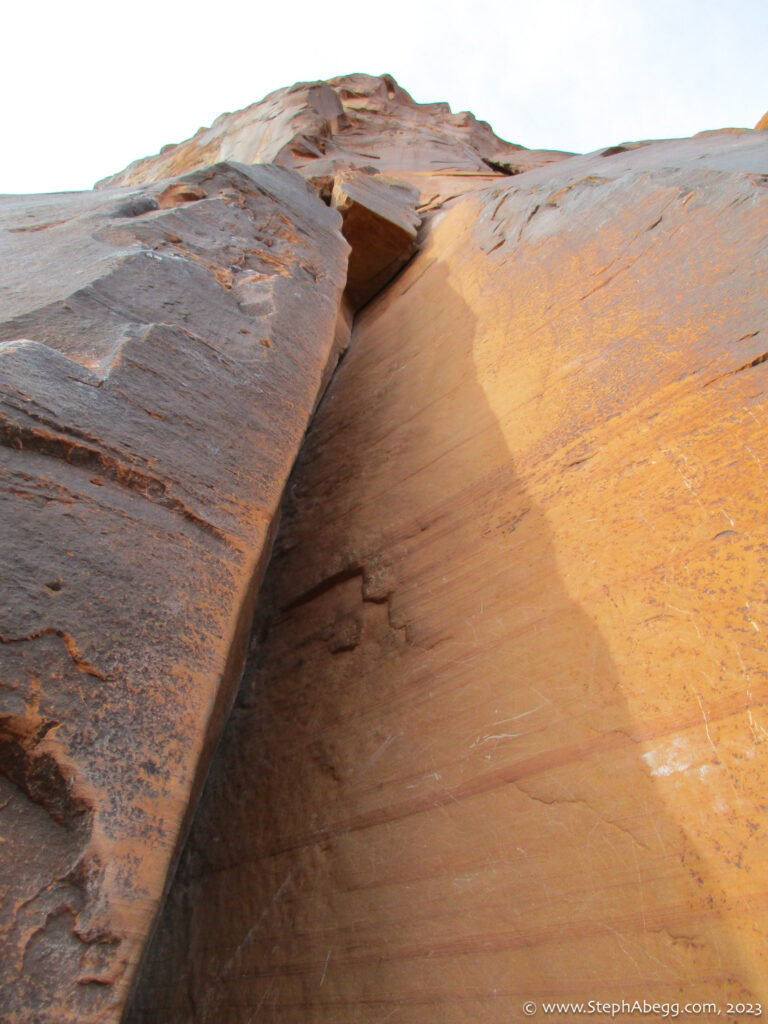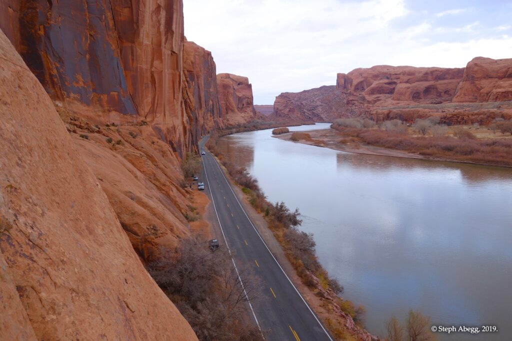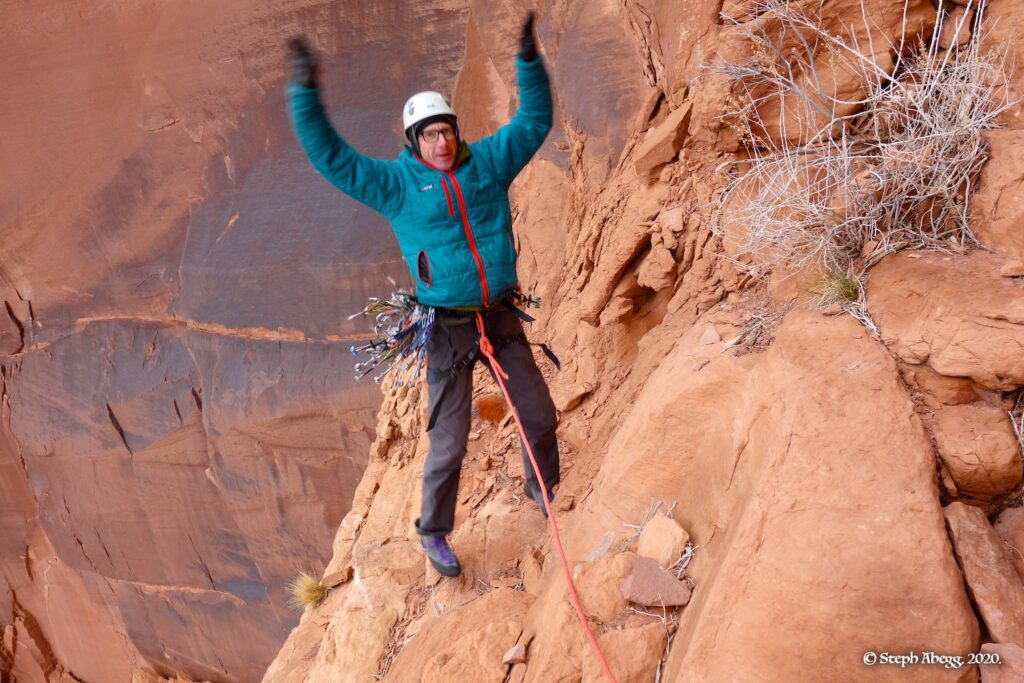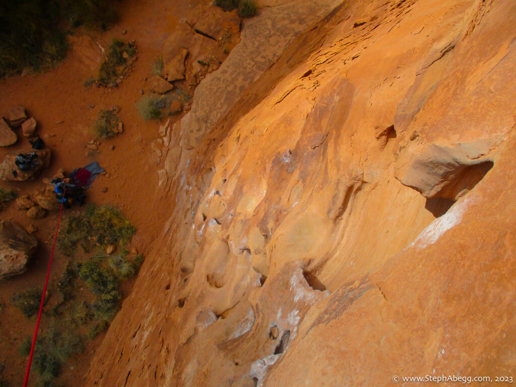 Indian Creek, where we planned to spend the rest of Thanksgiving week. However, an unforecasted snowstorm deposited 5 inches of snow on us after our first day. So we drove back to Moab and cragged a day at Wall Street while we waited for the snow to melt in Indian Creek. Wall Street is a popular cragging area near Moab. And for good reason. The 500-foot cliff of Navajo sandstone towers above the Colorado River and UT 279, and there are more than 100 routes, both bolted face and cracks, ranging in difficulty from 5.4 to 5.12. With its sunny aspect, Wall Street is a great place to spend a cool day.