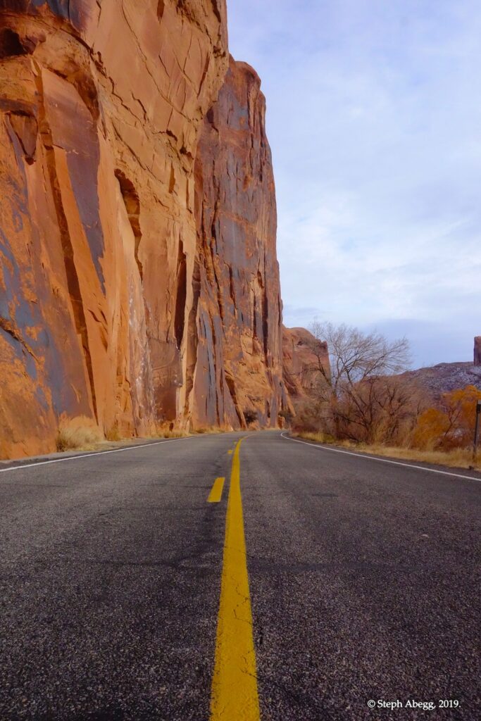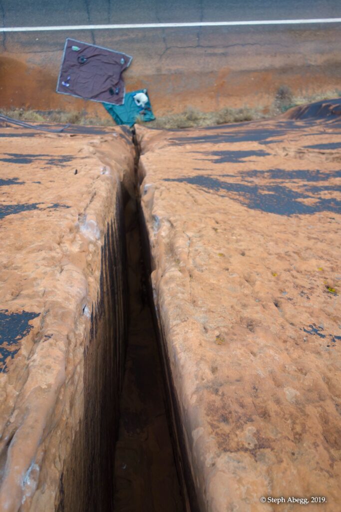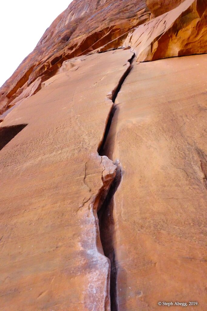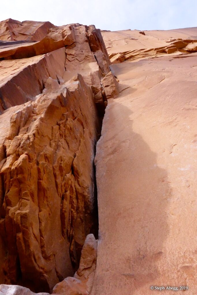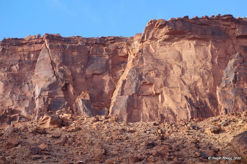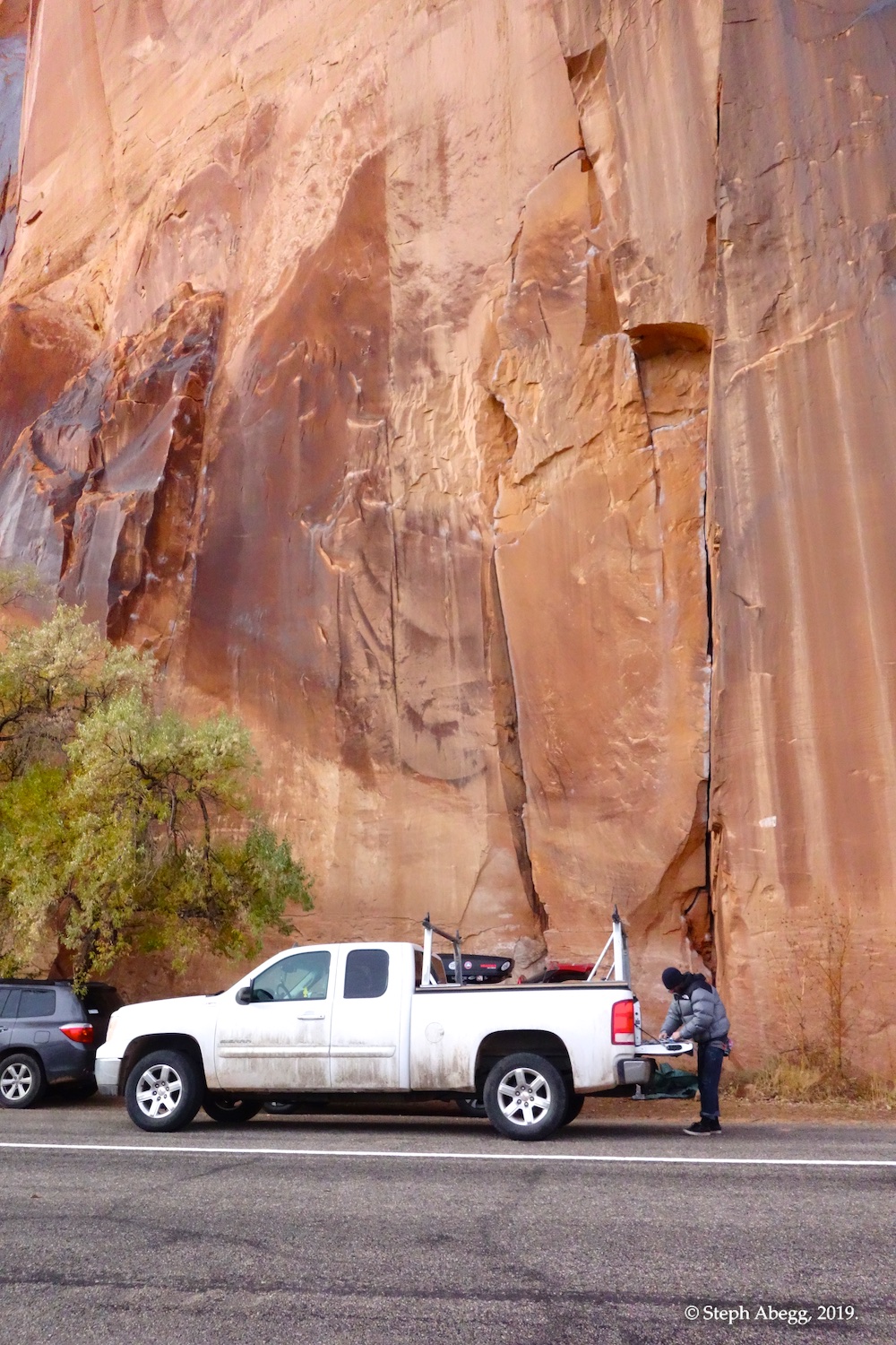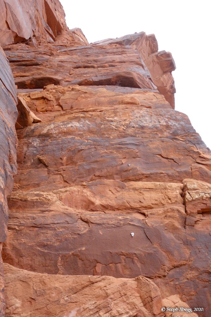Indian Creek, where we planned to spend the rest of Thanksgiving week. However, an unforecasted snowstorm deposited 5 inches of snow on us after our first day. So we drove back to Moab and cragged a day at Wall Street while we waited for the snow to melt in Indian Creek. Wall Street is a popular cragging area near Moab. And for good reason. The 500-foot cliff of Navajo sandstone towers above the Colorado River and UT 279, and there are more than 100 routes, both bolted face and cracks, ranging in difficulty from 5.4 to 5.12. With its sunny aspect, Wall Street is a great place to spend a cool day.