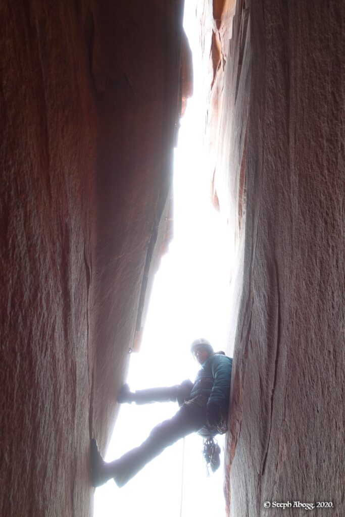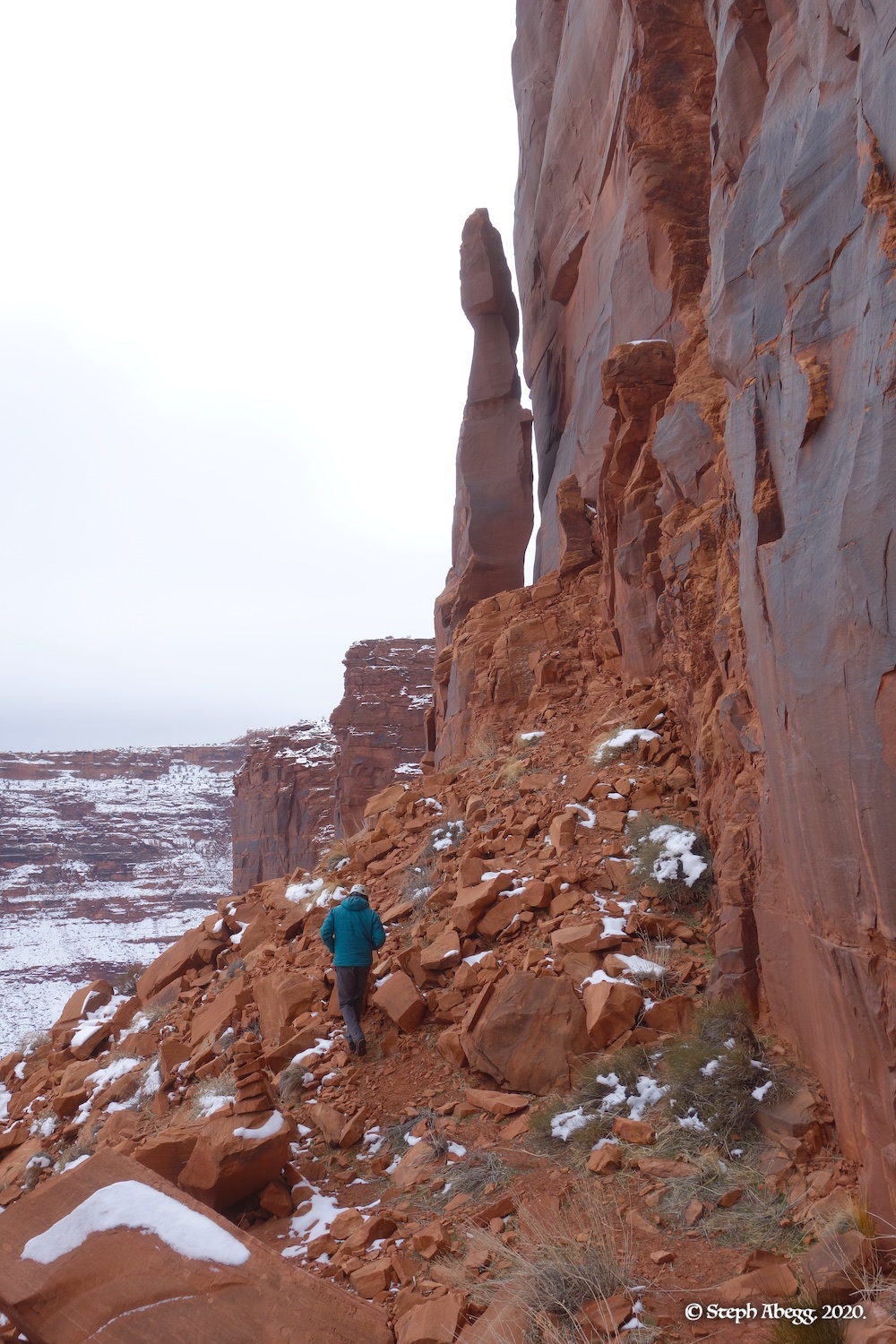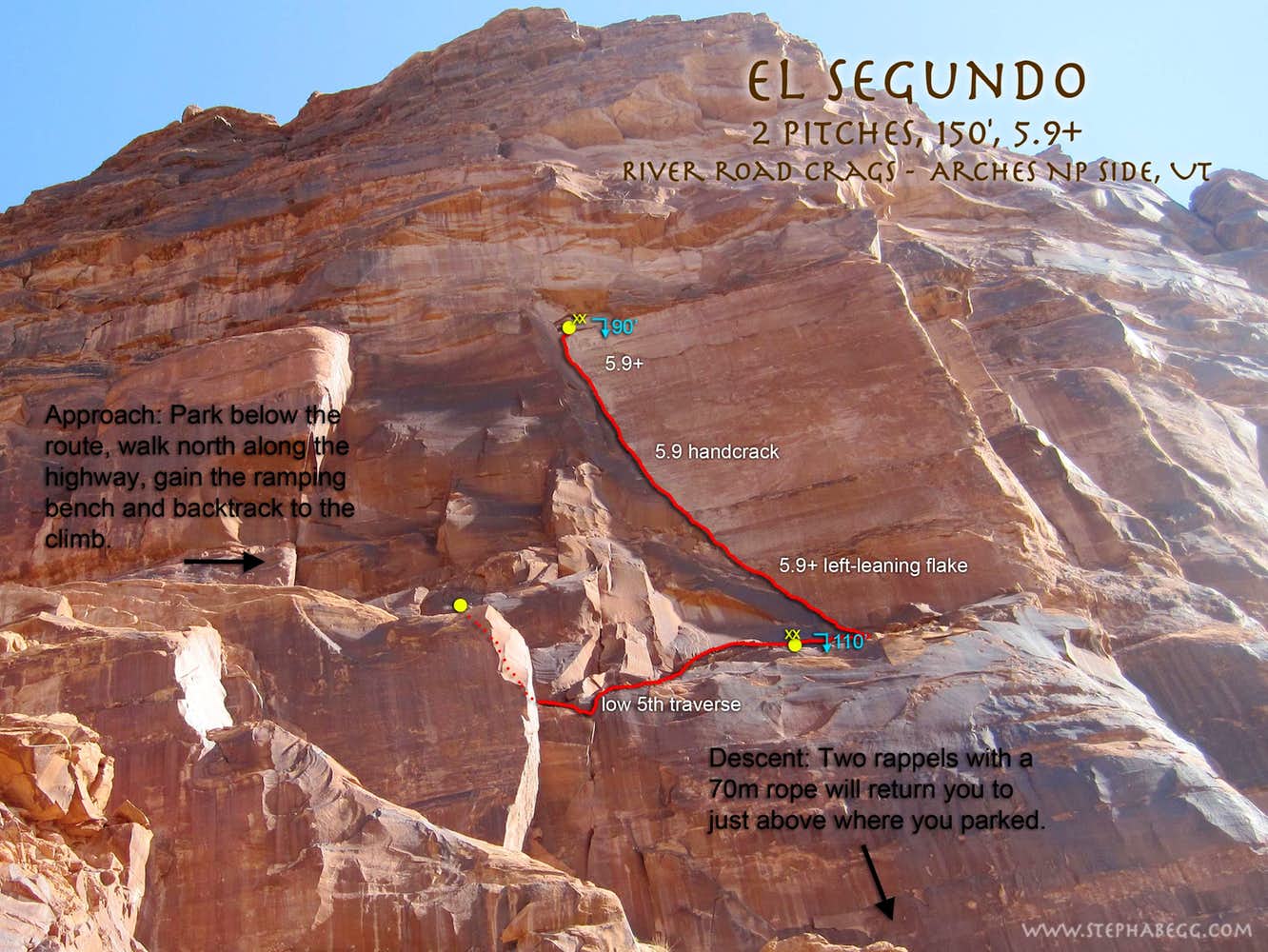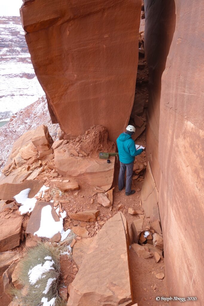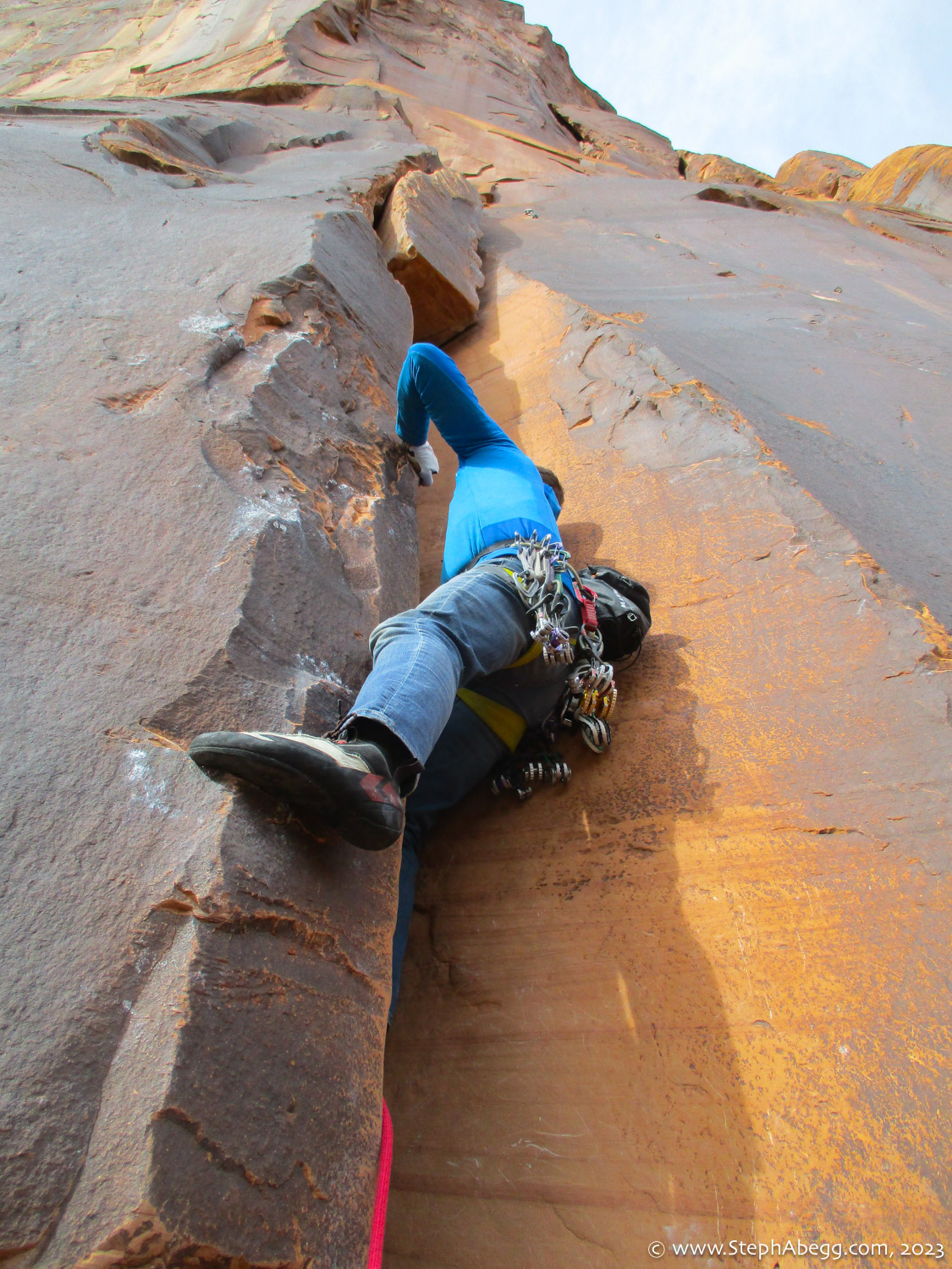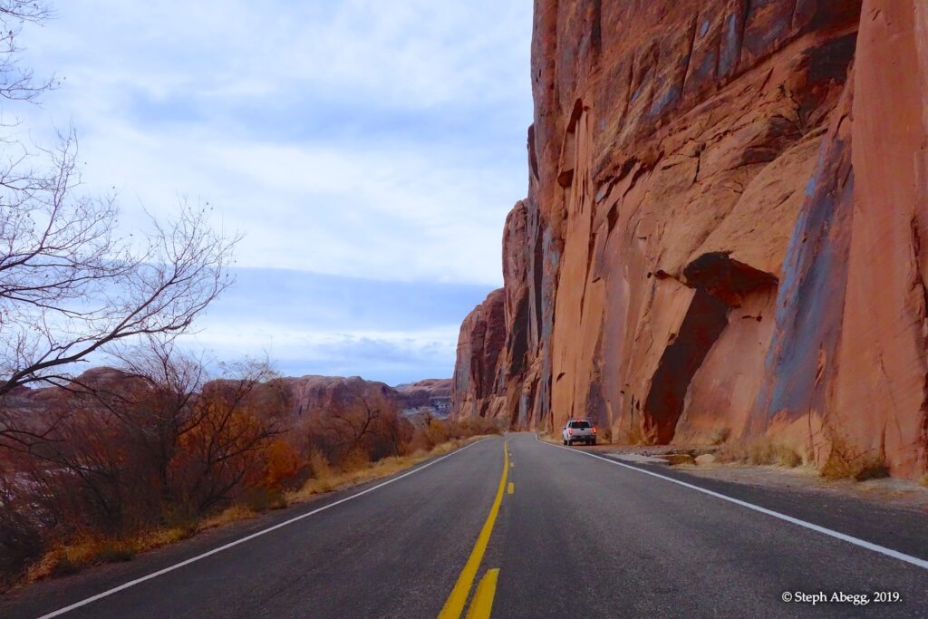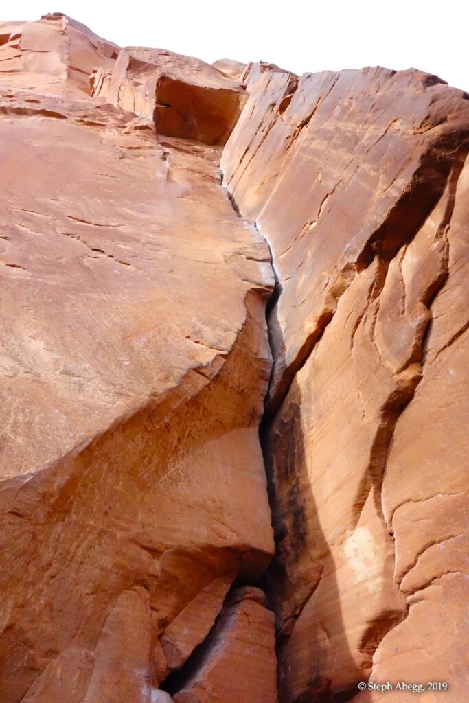 Indian Creek, where we planned to spend the rest of Thanksgiving week. However, an unforecasted snowstorm deposited 5 inches of snow on us after our first day. So we drove back to Moab and cragged a day at Wall Street while we waited for the snow to melt in Indian Creek. Wall Street is a popular cragging area near Moab. And for good reason. The 500-foot cliff of Navajo sandstone towers above the Colorado River and UT 279, and there are more than 100 routes, both bolted face and cracks, ranging in difficulty from 5.4 to 5.12. With its sunny aspect, Wall Street is a great place to spend a cool day.