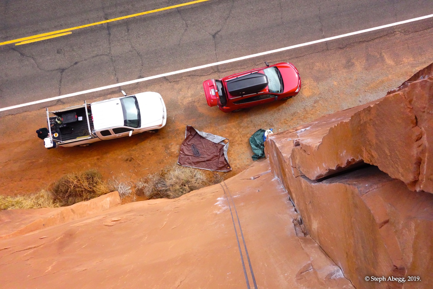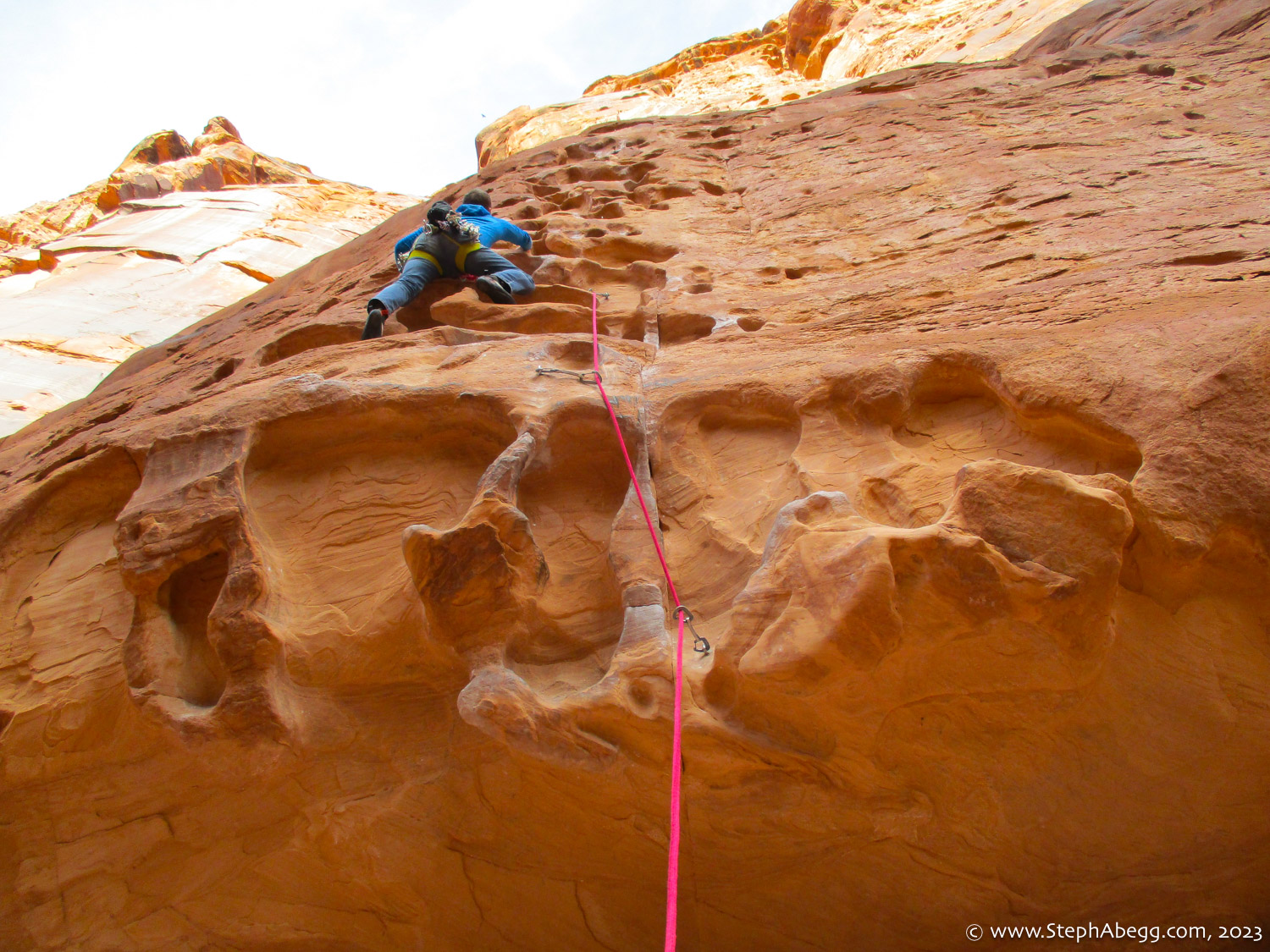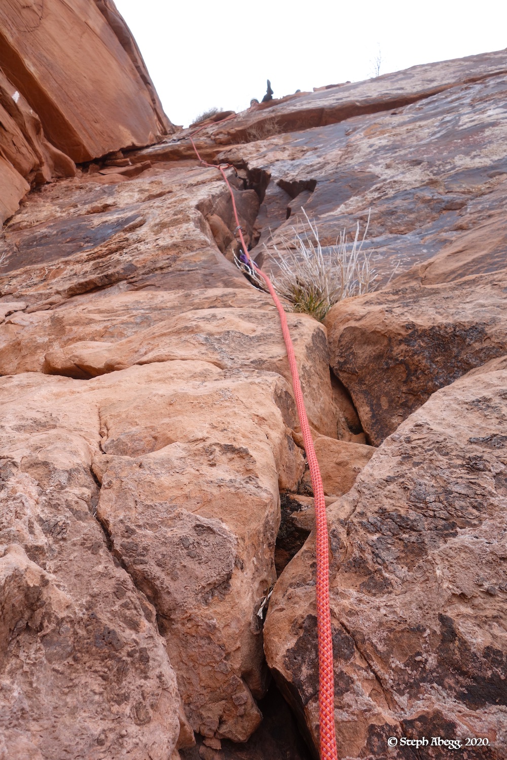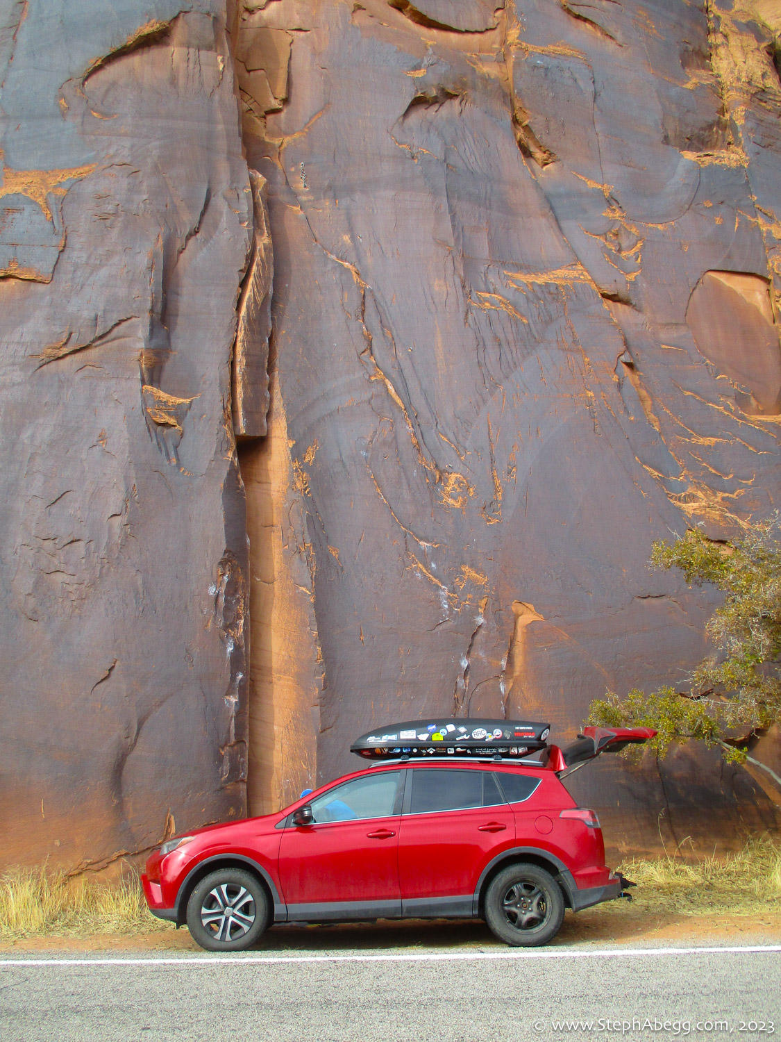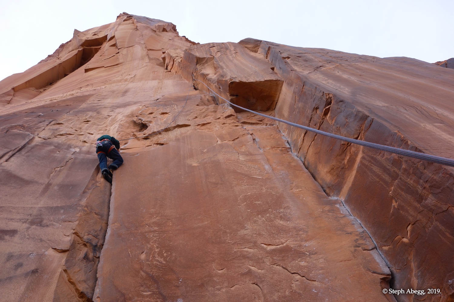 Indian Creek, where we planned to spend the rest of Thanksgiving week. However, an unforecasted snowstorm deposited 5 inches of snow on us after our first day. So we drove back to Moab and cragged a day at Wall Street while we waited for the snow to melt in Indian Creek. Wall Street is a popular cragging area near Moab. And for good reason. The 500-foot cliff of Navajo sandstone towers above the Colorado River and UT 279, and there are more than 100 routes, both bolted face and cracks, ranging in difficulty from 5.4 to 5.12. With its sunny aspect, Wall Street is a great place to spend a cool day.