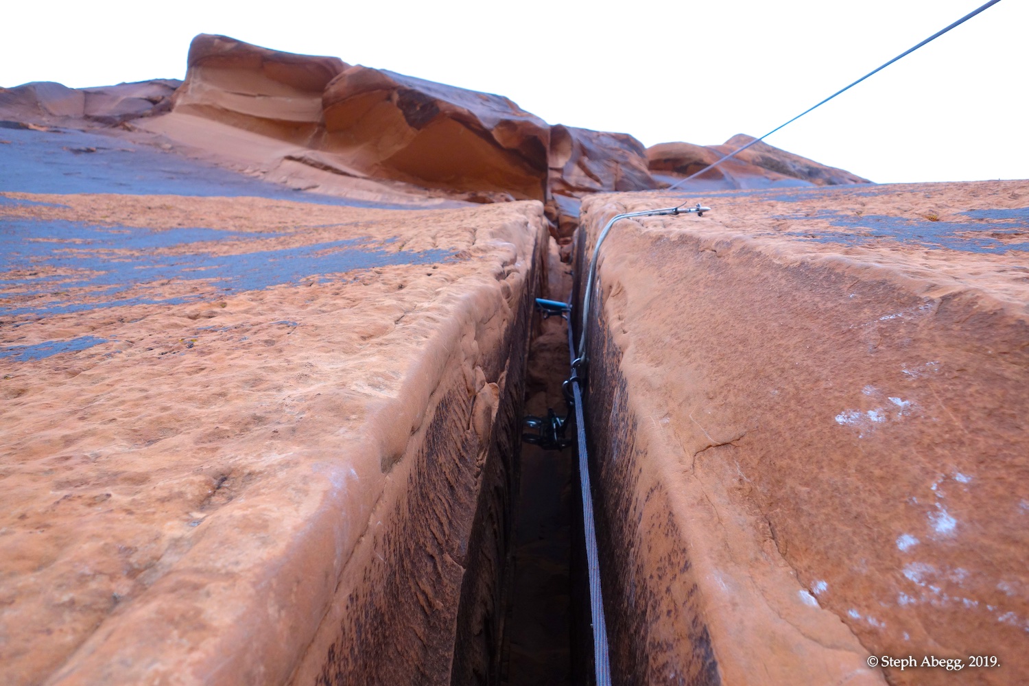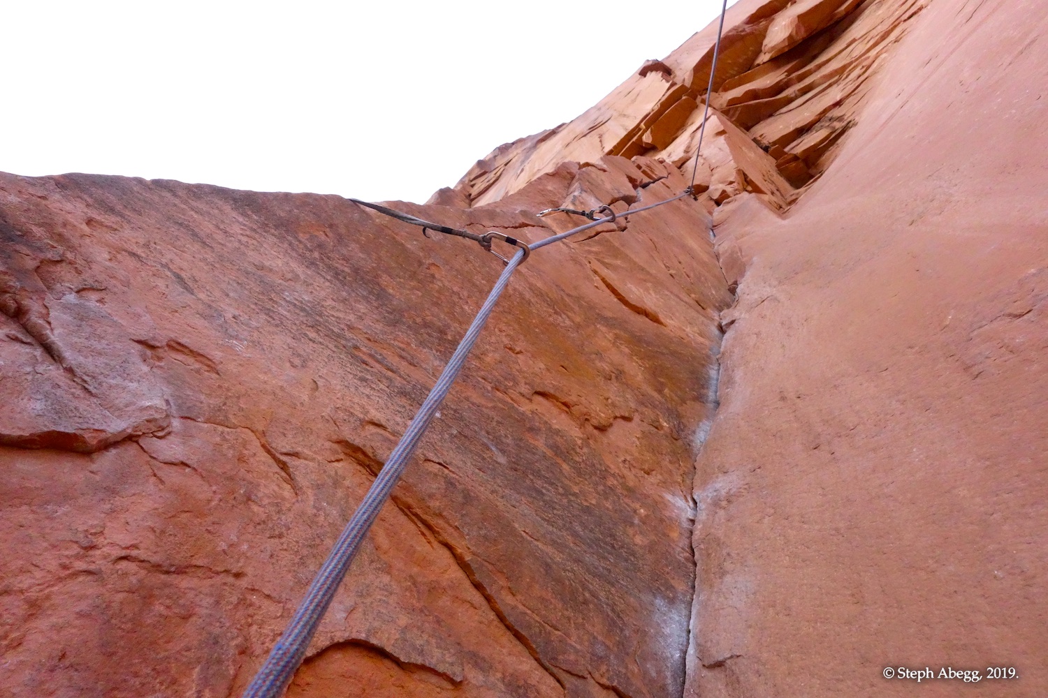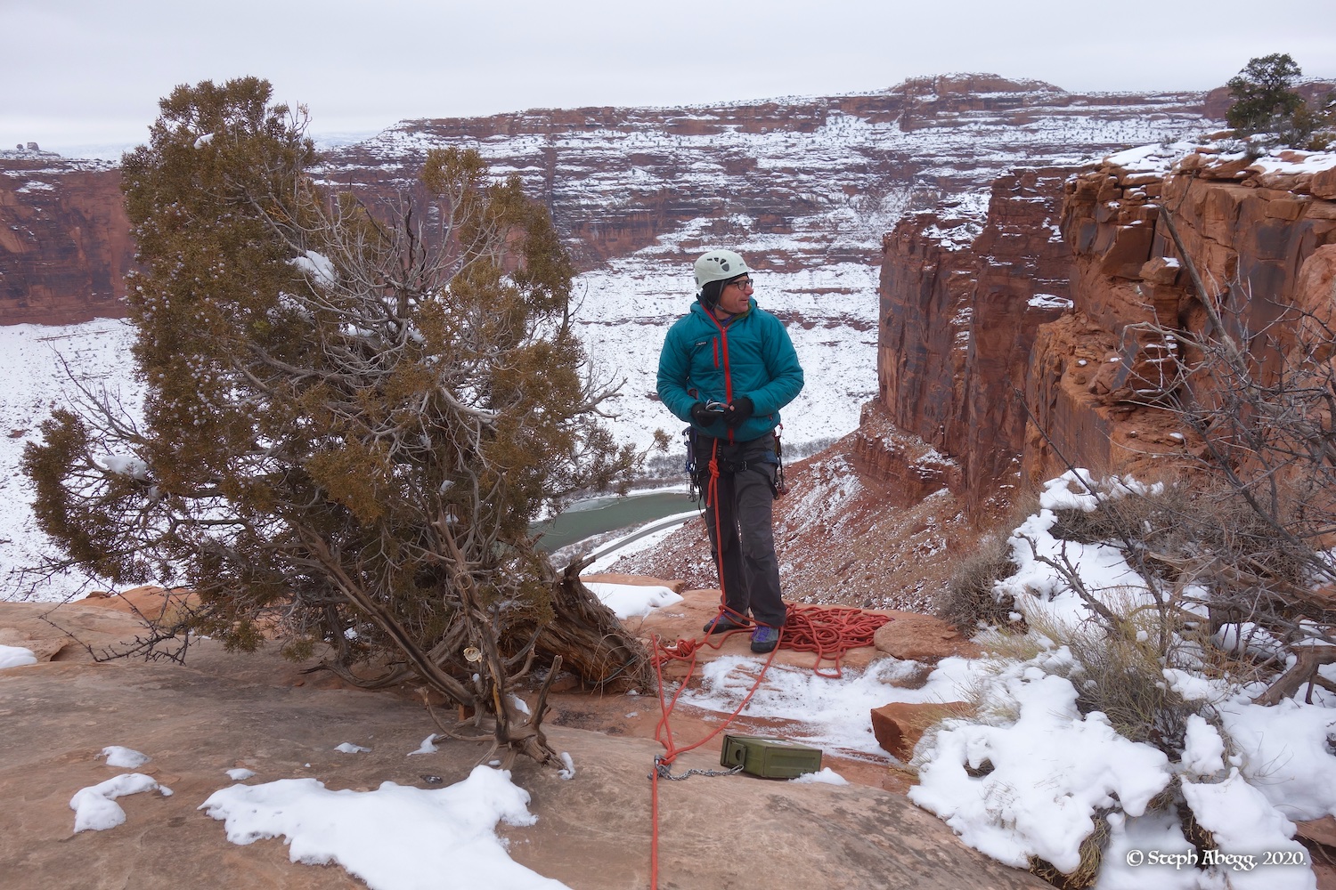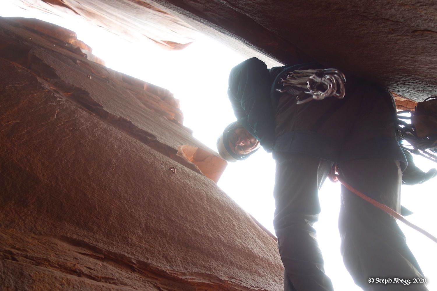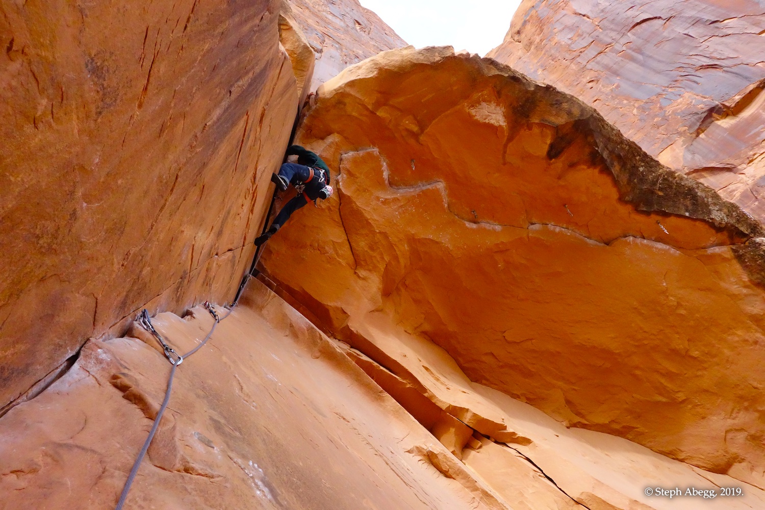 Indian Creek, where we planned to spend the rest of Thanksgiving week. However, an unforecasted snowstorm deposited 5 inches of snow on us after our first day. So we drove back to Moab and cragged a day at Wall Street while we waited for the snow to melt in Indian Creek. Wall Street is a popular cragging area near Moab. And for good reason. The 500-foot cliff of Navajo sandstone towers above the Colorado River and UT 279, and there are more than 100 routes, both bolted face and cracks, ranging in difficulty from 5.4 to 5.12. With its sunny aspect, Wall Street is a great place to spend a cool day.