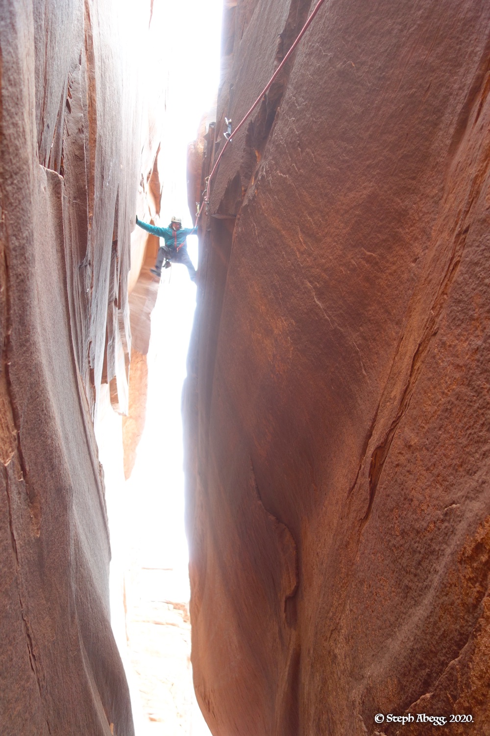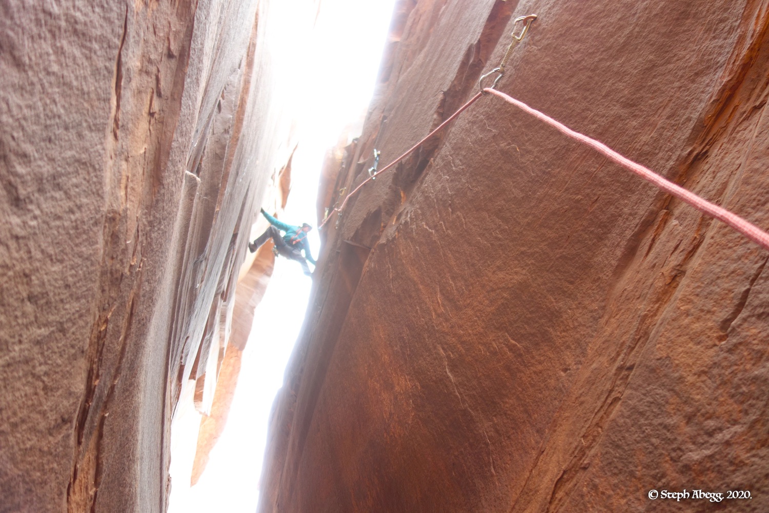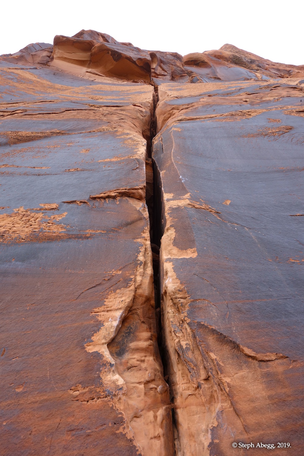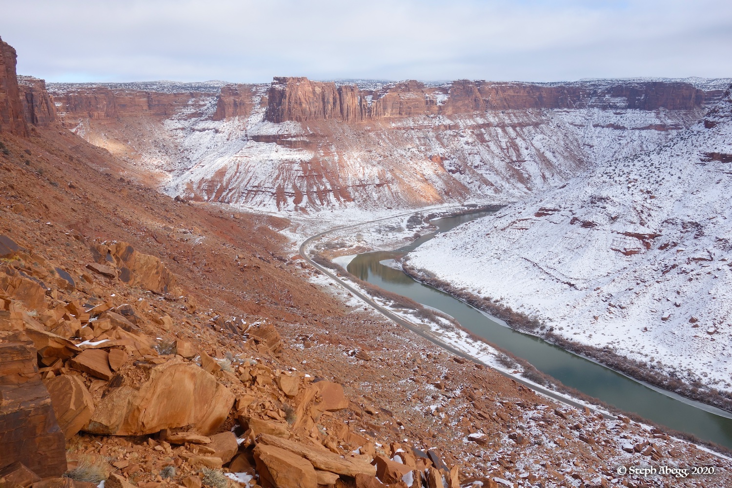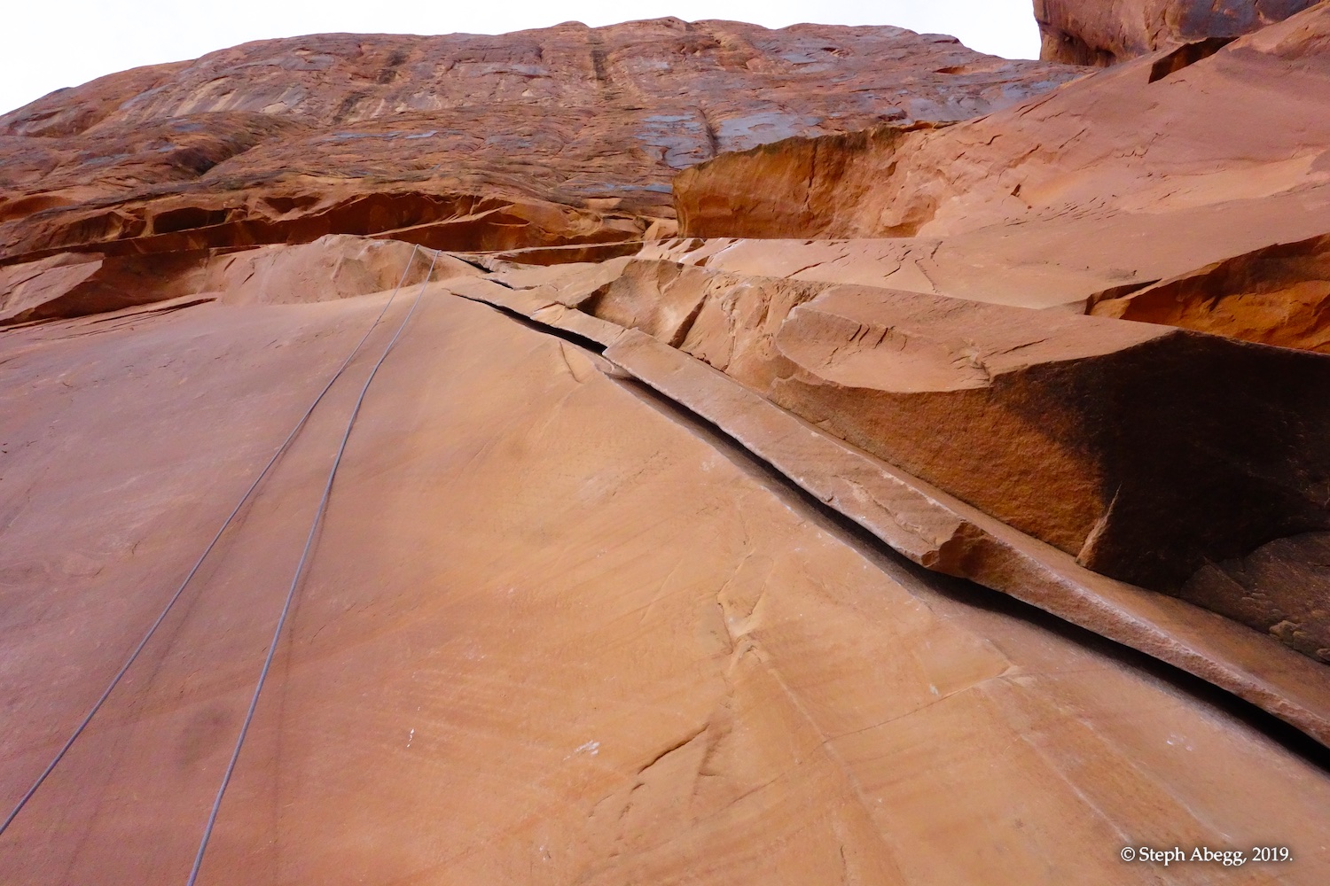 Indian Creek, where we planned to spend the rest of Thanksgiving week. However, an unforecasted snowstorm deposited 5 inches of snow on us after our first day. So we drove back to Moab and cragged a day at Wall Street while we waited for the snow to melt in Indian Creek. Wall Street is a popular cragging area near Moab. And for good reason. The 500-foot cliff of Navajo sandstone towers above the Colorado River and UT 279, and there are more than 100 routes, both bolted face and cracks, ranging in difficulty from 5.4 to 5.12. With its sunny aspect, Wall Street is a great place to spend a cool day.