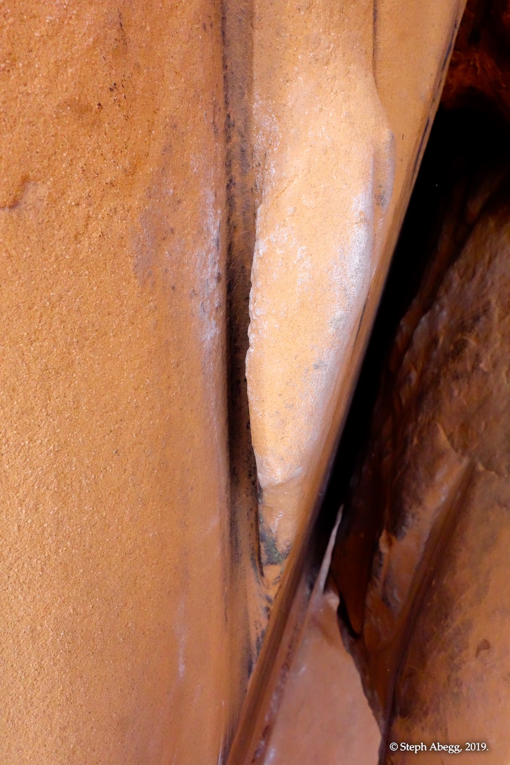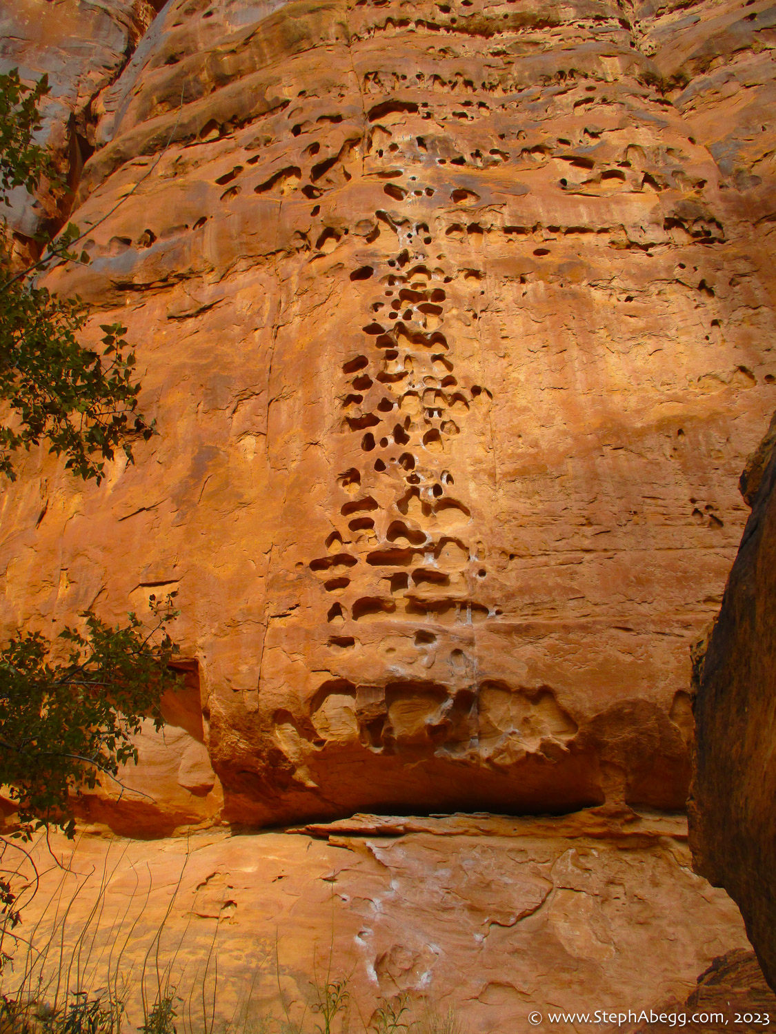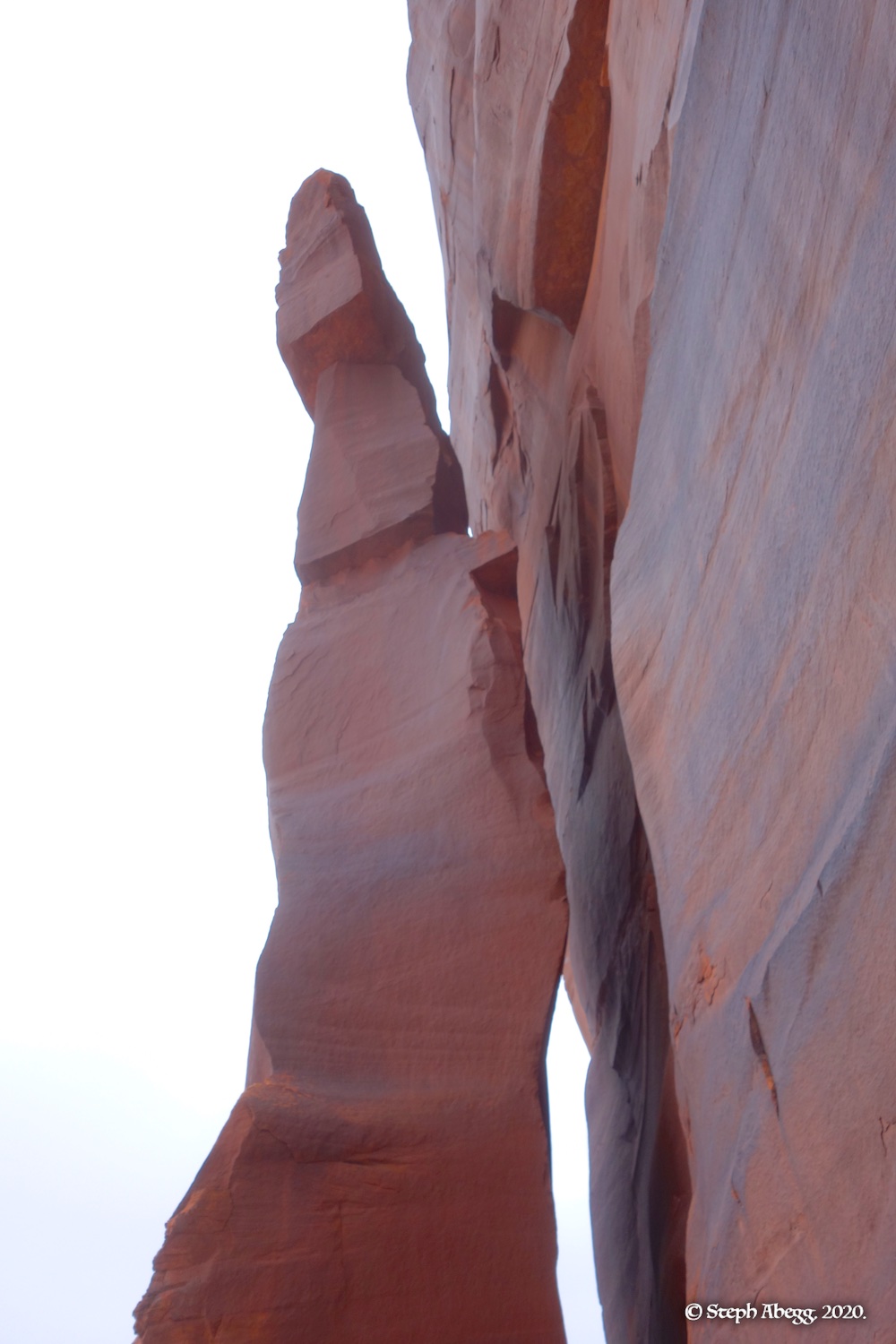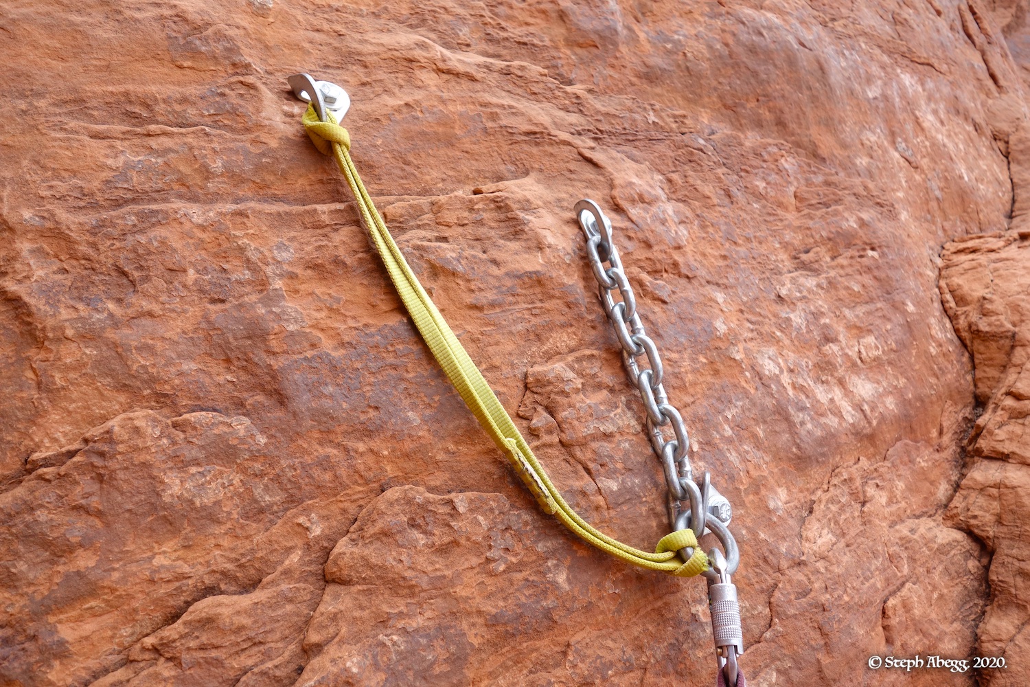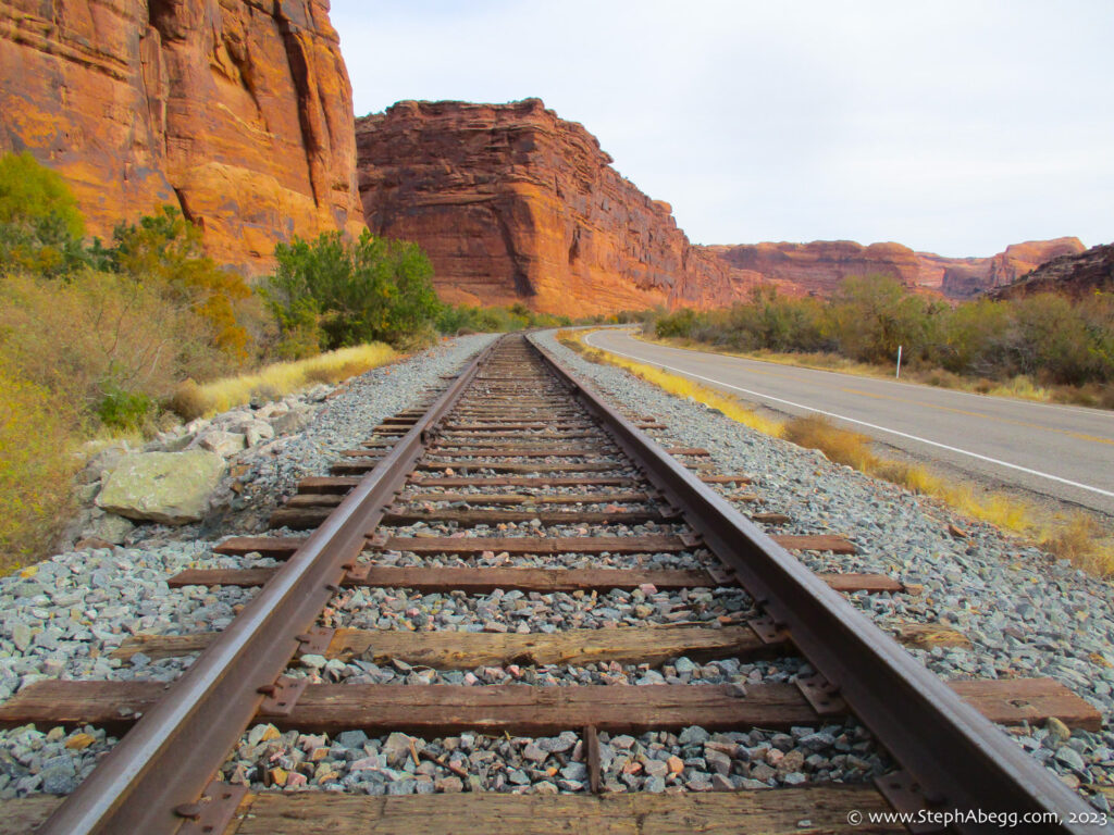 Indian Creek, where we planned to spend the rest of Thanksgiving week. However, an unforecasted snowstorm deposited 5 inches of snow on us after our first day. So we drove back to Moab and cragged a day at Wall Street while we waited for the snow to melt in Indian Creek. Wall Street is a popular cragging area near Moab. And for good reason. The 500-foot cliff of Navajo sandstone towers above the Colorado River and UT 279, and there are more than 100 routes, both bolted face and cracks, ranging in difficulty from 5.4 to 5.12. With its sunny aspect, Wall Street is a great place to spend a cool day.