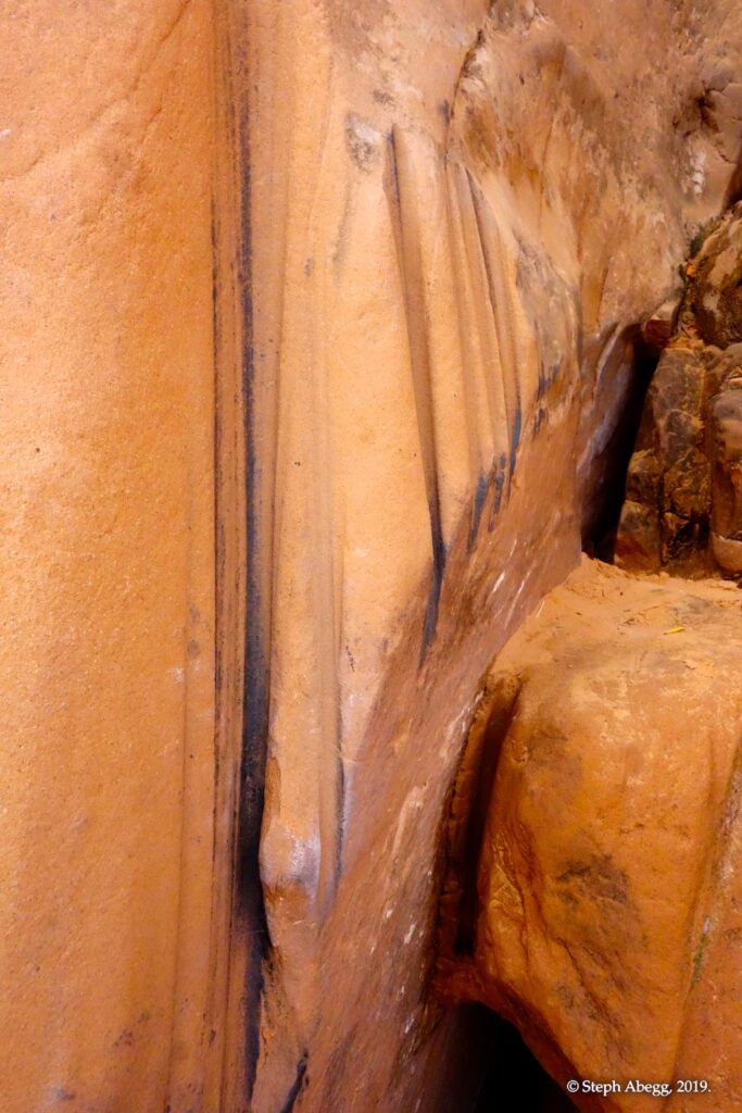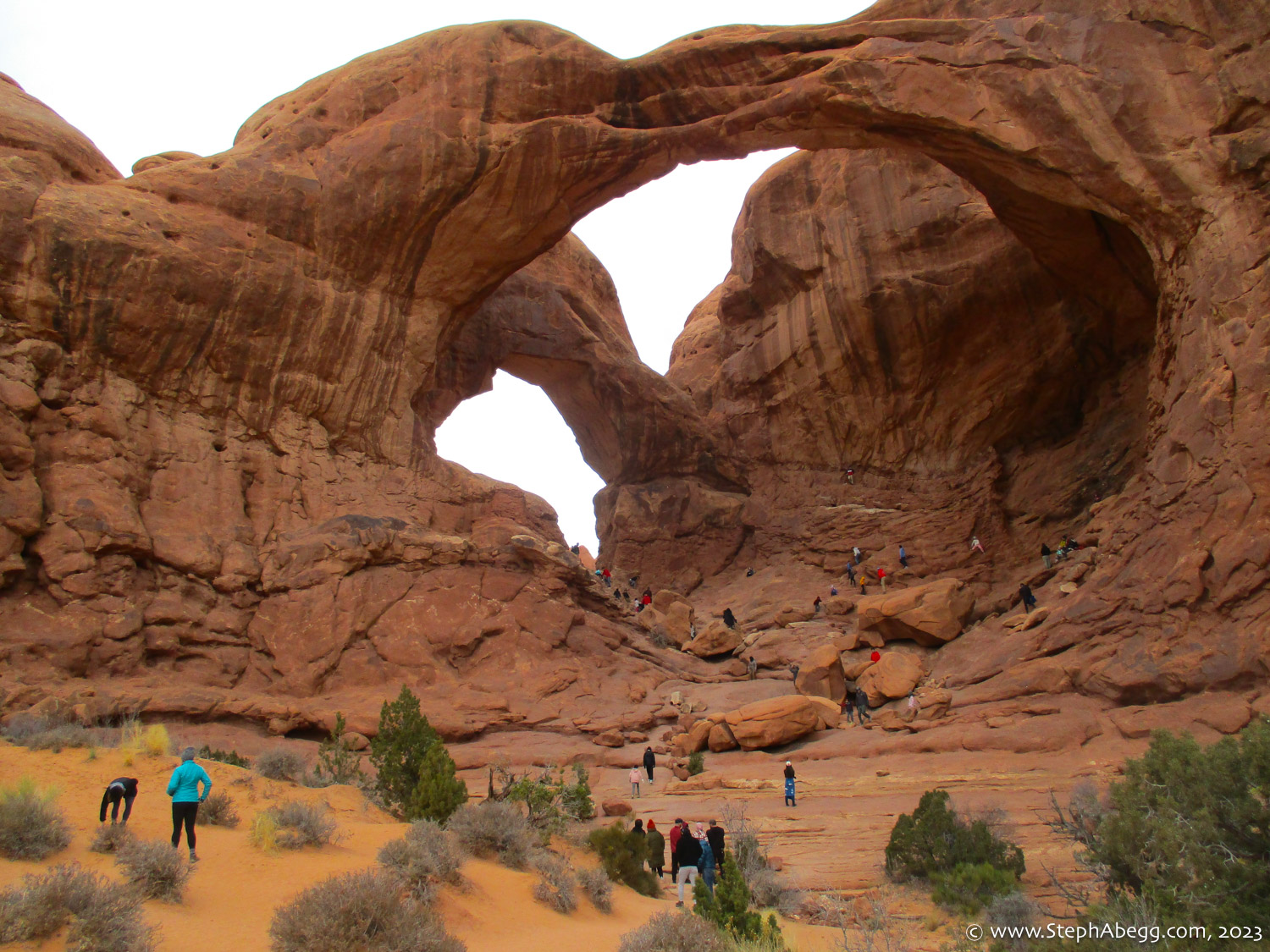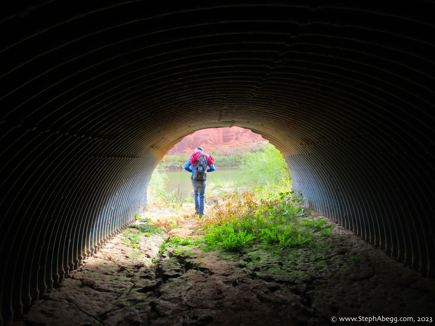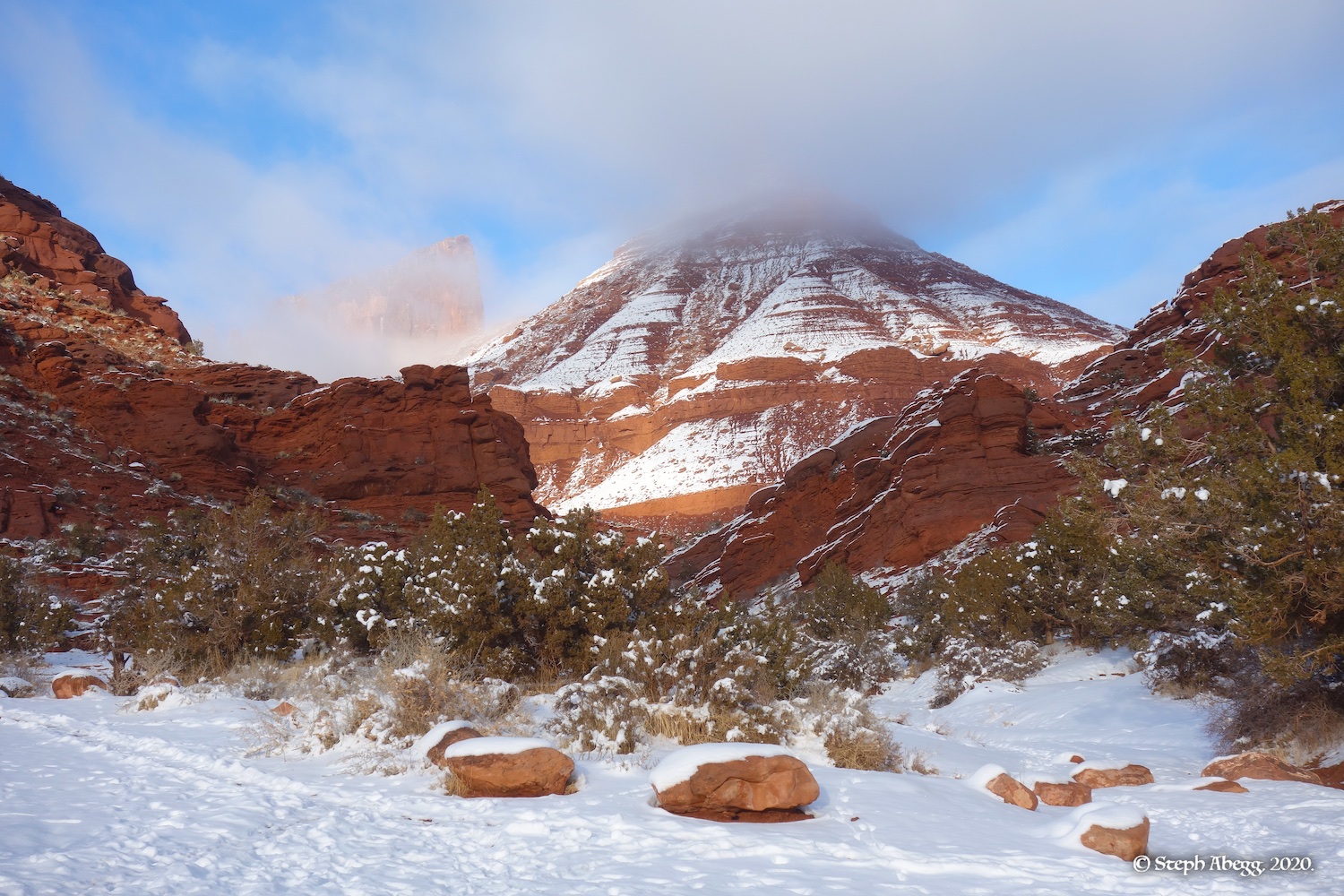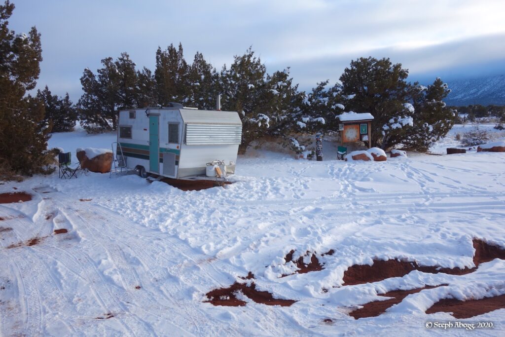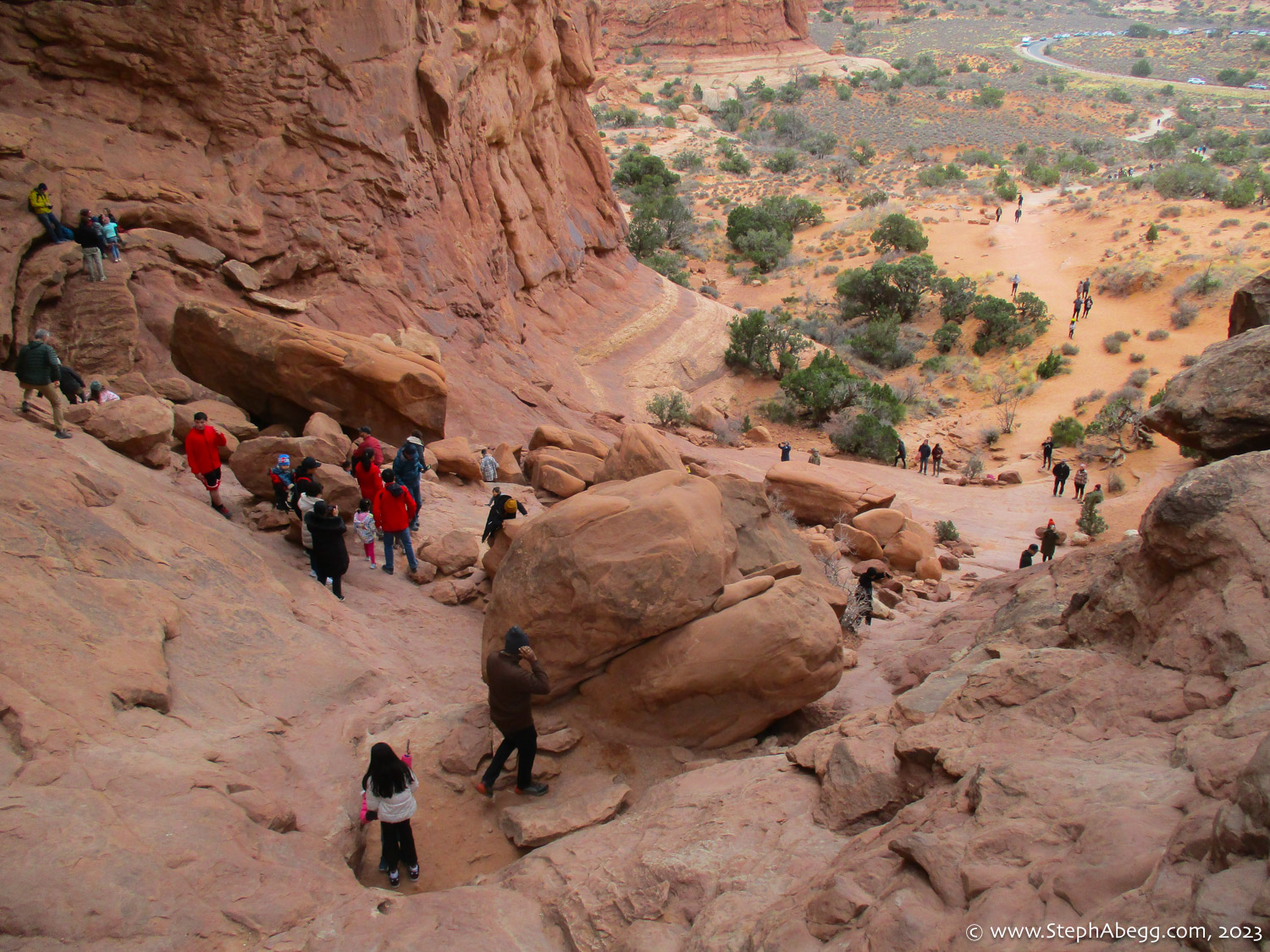 Indian Creek, where we planned to spend the rest of Thanksgiving week. However, an unforecasted snowstorm deposited 5 inches of snow on us after our first day. So we drove back to Moab and cragged a day at Wall Street while we waited for the snow to melt in Indian Creek. Wall Street is a popular cragging area near Moab. And for good reason. The 500-foot cliff of Navajo sandstone towers above the Colorado River and UT 279, and there are more than 100 routes, both bolted face and cracks, ranging in difficulty from 5.4 to 5.12. With its sunny aspect, Wall Street is a great place to spend a cool day.