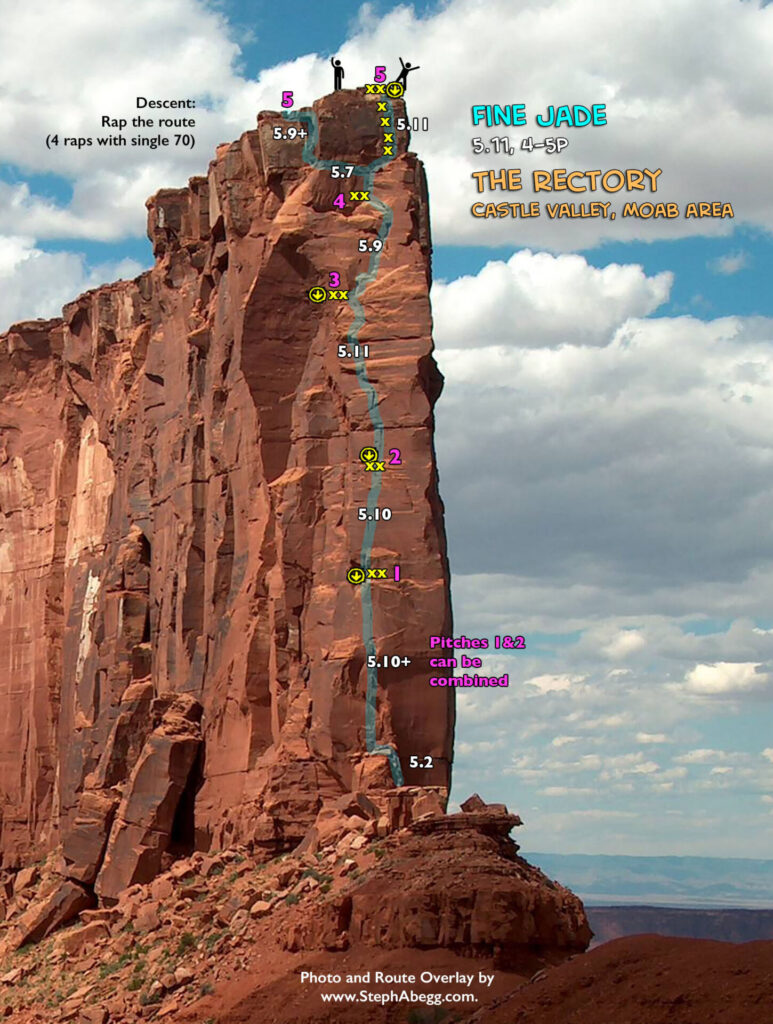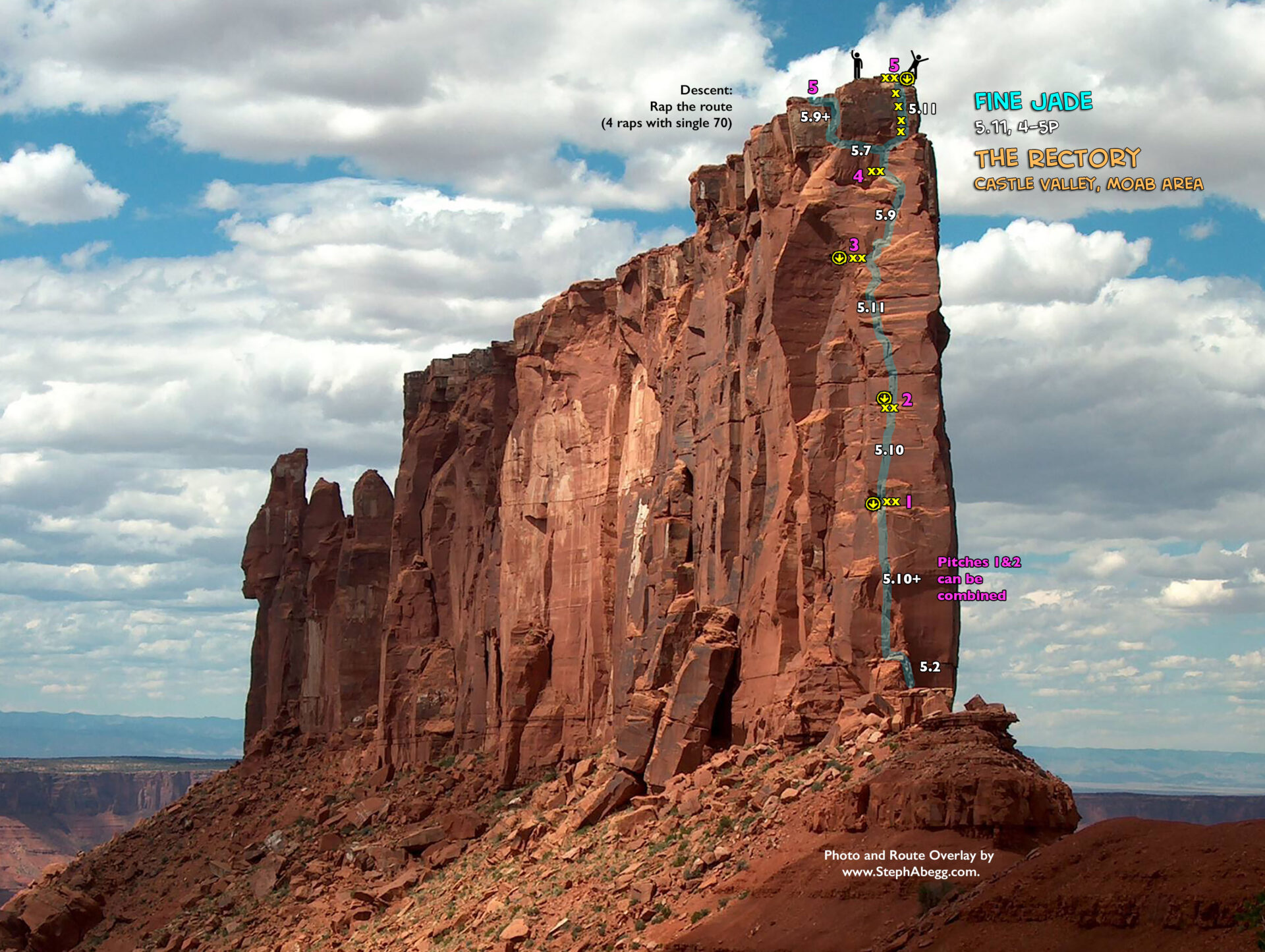 Fine Jade (5.11, 5p) on The Rectory, just across from Castleton Tower. This route had been on my to-climb list for a long time. It is one of Moab's best climbs, with lots of challenging and varied crack climbing. We swung leads, with Linn (who had climbed the route before and is a stronger leader than I) led the crux pitches. When we got to the top, we were sad it was over. It was a perfect bluebird day, sunny but not too hot. Despite the perfect weather, we had the popular climb to ourselves.