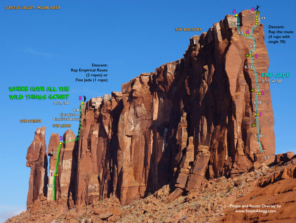 Hike up the Castleton trail and continue along the ridge between Castleton and The Rectory to the base of The Rectory. Fine Jade climbs the obvious splitter on the south prow. To get to the base of Where Have All the Wild Things Gone continue on a trail under the western walls of The Rectory to the north end, where The Nuns merges with The Rectory. The route starts in a corner just right of an obvious area of calcite. | |