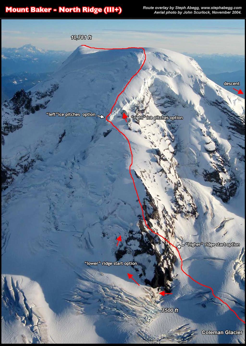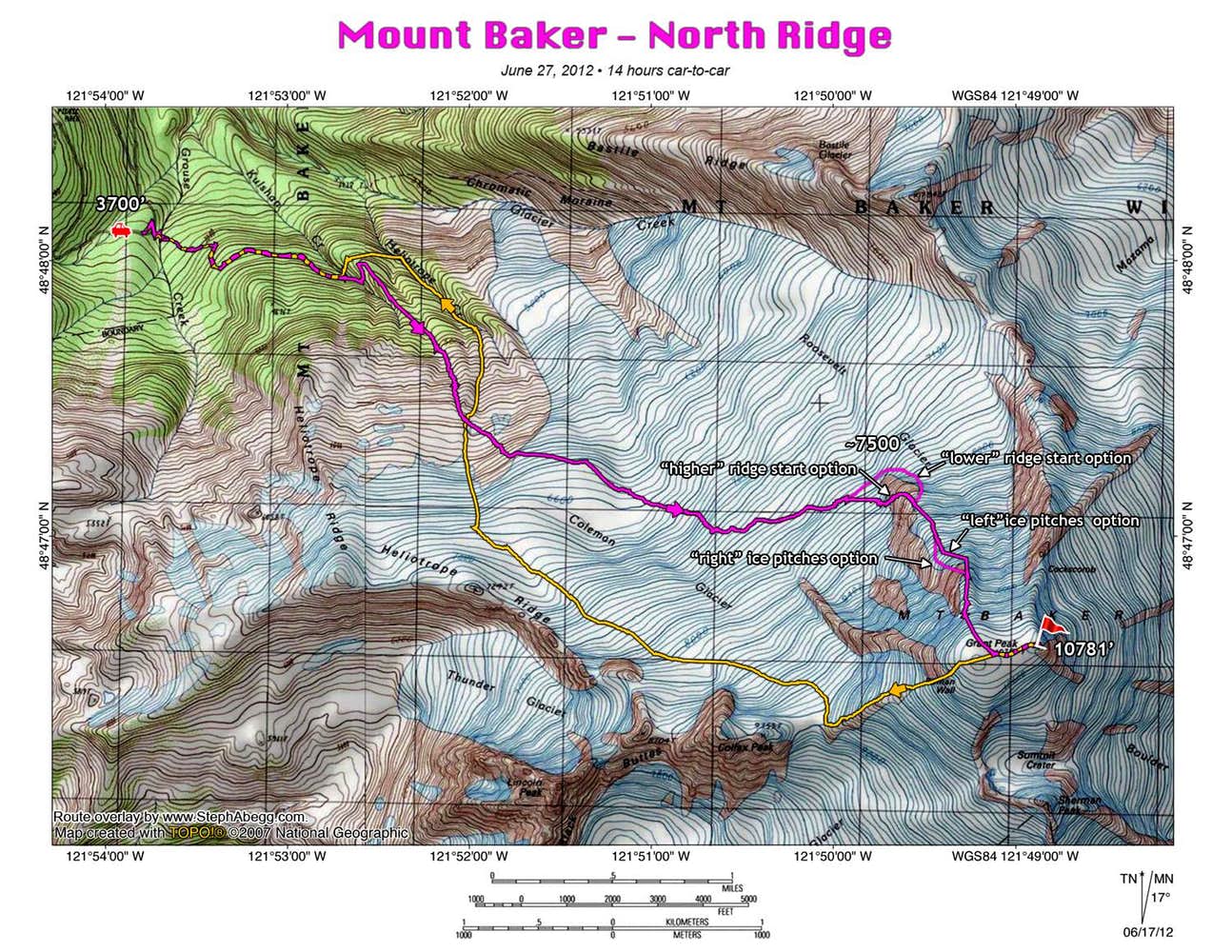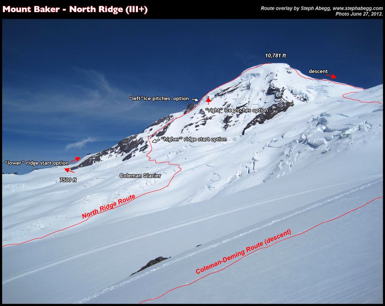 There is plenty of route beta for Baker's North Ridge in printed guides and online, so in the following trip report I will just provide more interesting stuff like stats, an aerial view of us on the crux ice step, route overlays, and (of course) plenty of photos from the climb.