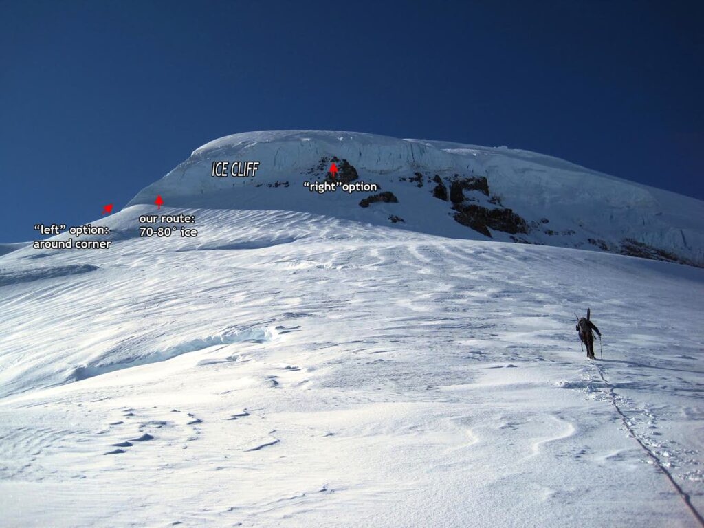 At 9,600', things get interesting. Here there is an obvious steep step. There are several possible route variations here. We chose to go left, while a couple of other parties on the route chose to go right. If we had gone left around the toe of the ridge, it would actually have been pretty mellow, but we got suckered into a 70-80° ice cliff (just to the right of Daniel in this photo).....