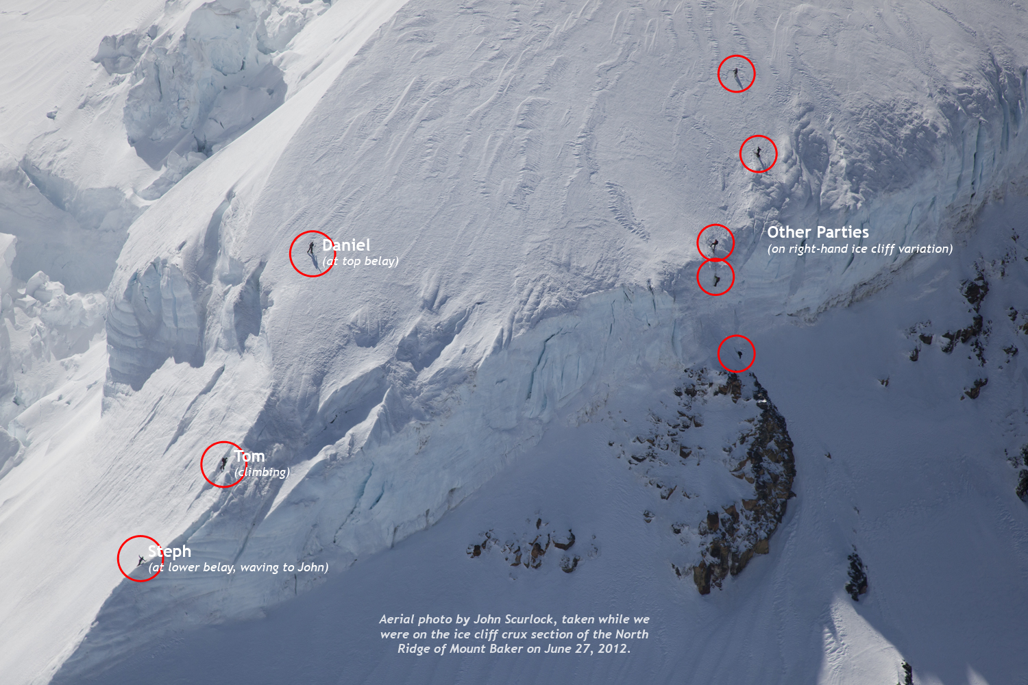 Friend and aerial photographer John Scurlock knew I was climbing the north ridge of Baker, so he made a brief Baker detour on a fueling flight to Arlington. When I got home, sure enough, there was an email and a bunch of photos from John. Pretty cool to see yourselves climbing from this perspective!
