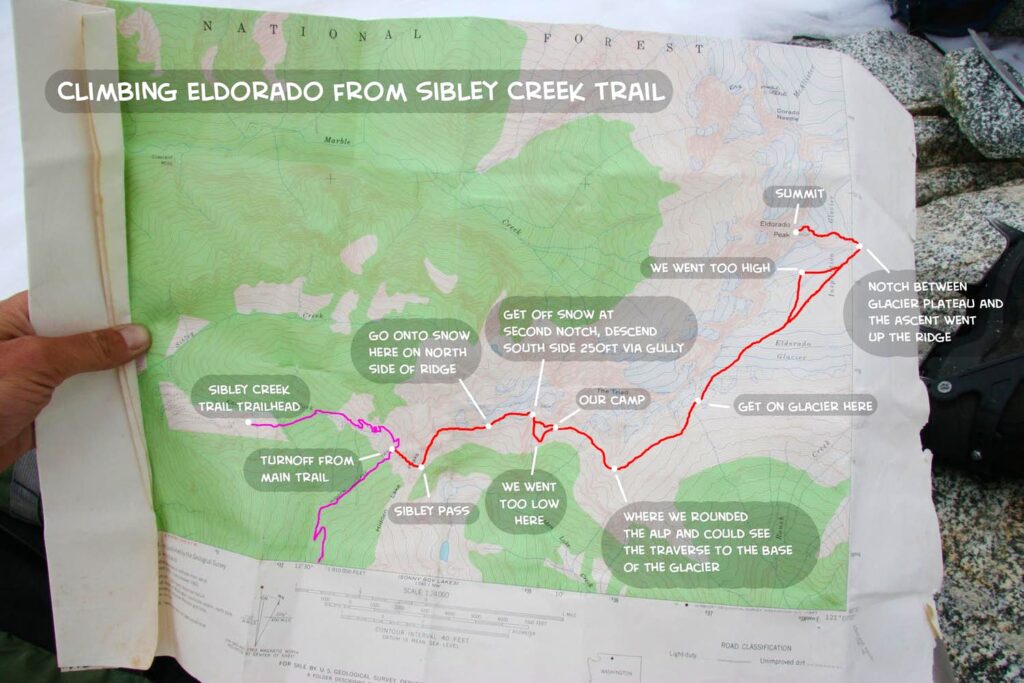 Climbing Eldorado involves a significant approach and we planned on hiking in as far as we could and climbing Eldorado the next day. We began by hiking about 2.5 miles up the Sibley Creek trail; here, at about 5,300 ft, we turned off to climb up to Sibley Pass (6,040 ft). There is a convenient trail up to Sibley Pass which turns off the main trail at a rocky gully. Of course following a trail is too easy, so we turned off about 300 ft too early to do some enlightening bushwhacking through slippery heather and loose rock. Even with this detour, we reached the pass in under an hour from where we turned off the main trail.