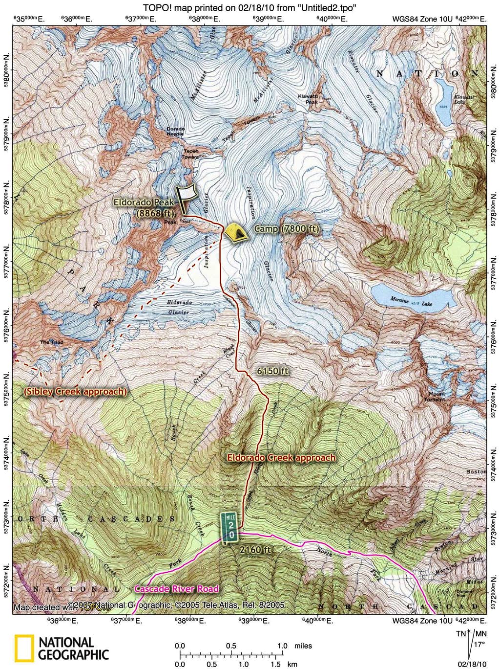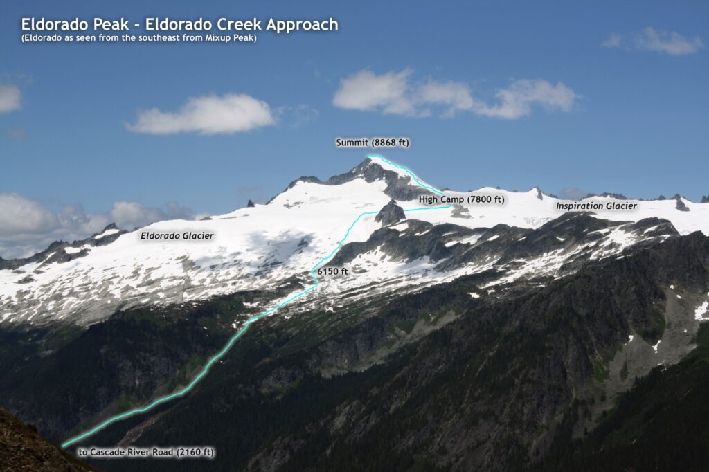 (Some of the following description is from the Summitpost description of Eldorado.) Road and trailhead: Route to high camp: At 4000ft or so, you'll find a talus field (blissfully snowcovered in the winter). This field connects to a second larger field traversing up and right beneath a large and imposing granite arm (which turns into the Roush Creek - Eldorado Creek Ridge). Head up to small waterfalls at 5000ft and a steep muddy trail leads through the falls to something of an opening at 5400ft. Camp at 5400 ft or continue upwards. Continue up heather and rock slabs (or snow in early season or winter) until able to climb that same ridge around 6000ft or so. At 6150ft - where the ridge steepens - descend left into a class 3 gully into Roush Basin. The gully is marked by a large boulder just below the ridge crest. Do not descend the wrong gully - a number look promising - because they are down-slabby and nasty compared to the RIGHT one. Once in Roush Basin, head towards the SE edge of the Eldorado Glacier. Snow slopes lead to a large flat saddle at 7500ft. There are good bivy sites here, or at a rock island at 7800ft at the base of Eldorado's East Ridge. Pitch a tent, melt some water, and cook some grub. You have finally arrived, 7-10 hours from the parking lot. Masochists find this approach to be one of the highlights of the North Cascades! Always worth it! Note that the Sibley Creek approach is another alternative. I've done this approach back in 2006 (click here for that trip report), and highly recommend it. It is not as direct as the Eldorado Creek Route, but it follows a beautiful and non-strenuous ridgeline speckled with flowers in the summer. Route to summit: |