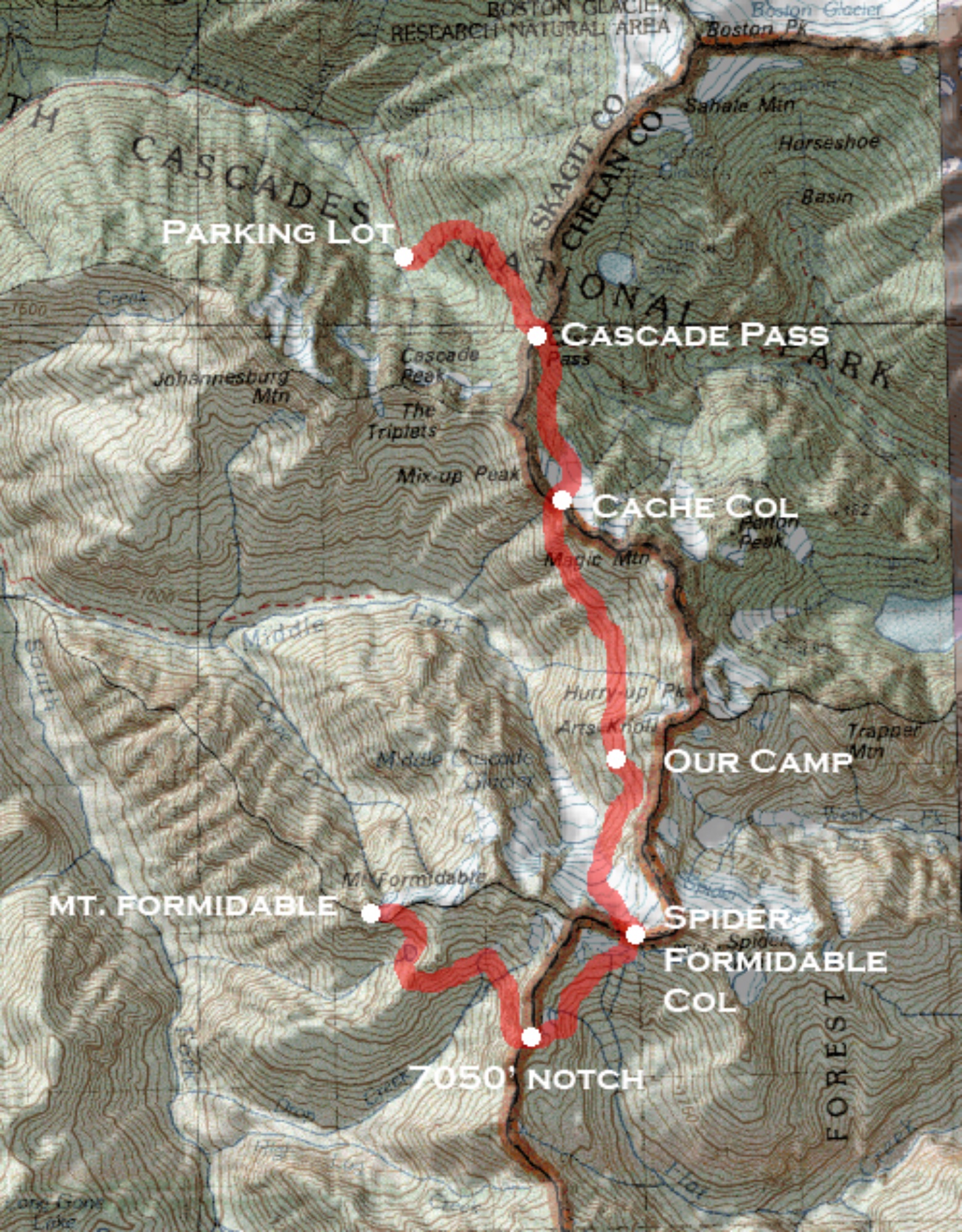 The map of the route shows the route we took on our 3-day adventure on the first part of the Ptarmigan Traverse. We hiked from the Cascade Pass trailhead to a beautiful camp just south of Red Ledge (we did this in 6 hours of hiking at a relatively relaxed pace). We then climbed the south side of Mt. Formidable the next day, and hiked out the day after that.