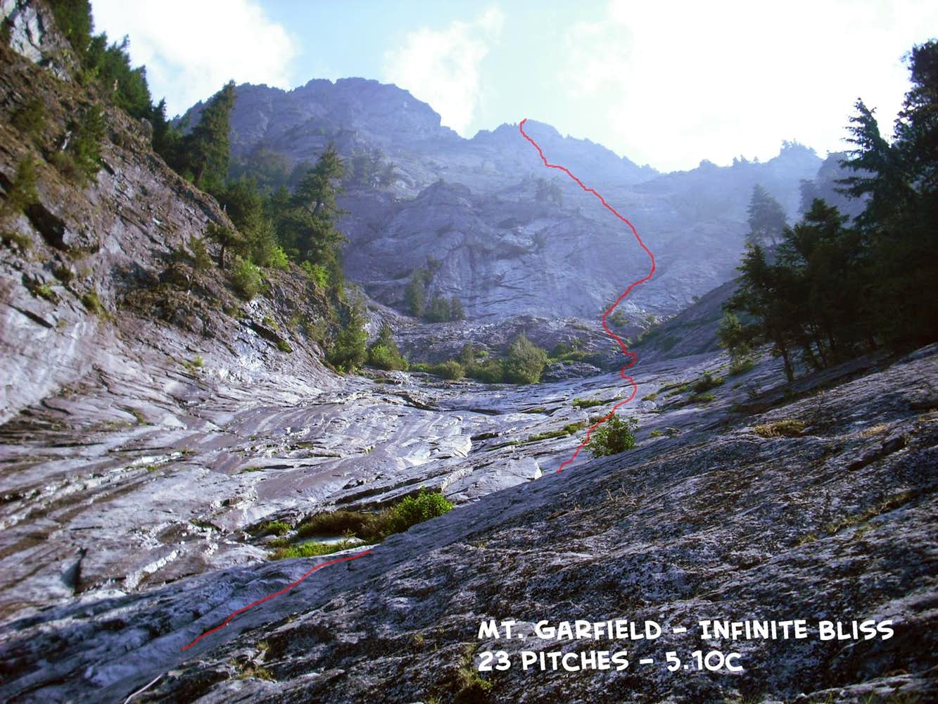 With my final final exam of the year over and a good forecast for the next day, I thought it'd be fun to climb Infinite Bliss, a 23 pitch bolted climb (crux 10c) on Mt. Garfield's West Peak. This impressively long route climbs roughly 2600 vertical feet, and is claimed to be the longest "sport" climb in North America (although I would call the route "bolt-protected" rather than "sport", since it is not a sport climb in the typical sense of the word). This climb has been a topic of contention among alpine climbers. I certainly do not want bolts to become a norm on North Cascades peaks, but this was not going to keep me from climbing a route that sounded like a lot of fun!