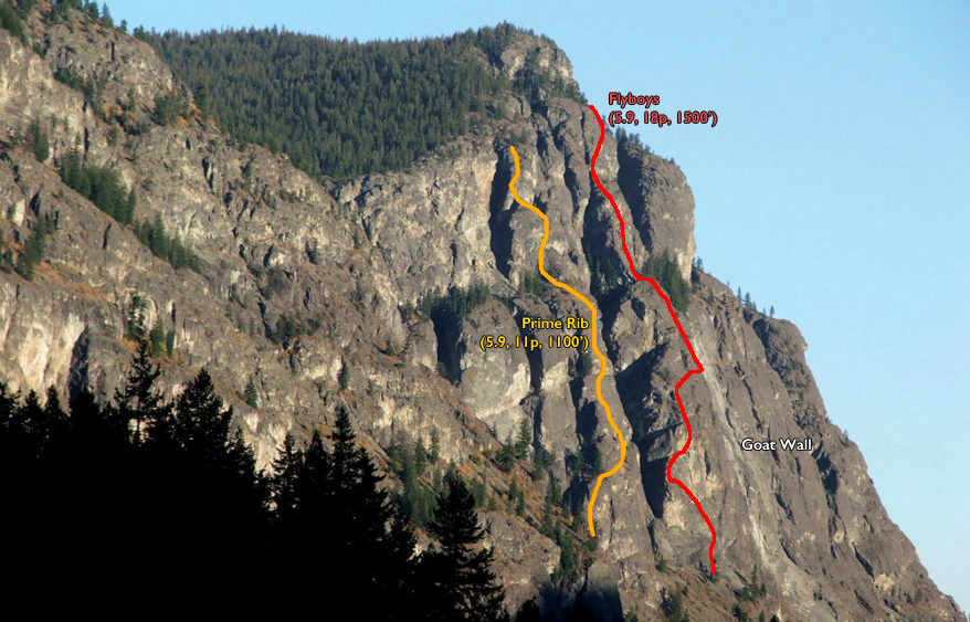 Flyboys ascends Goat Wall's central rib in 18 pitches and 275 bolts. As of 2018, it the longest route on Goat Wall, and perhaps the longest bolted 5.9 in the United States. It is also the newest of the above-mentioned routes on Goat Wall, established in 2016 and 2017 by Brian Burdo and Jerry Daniels. The following description of Flyboys from an article on climbing.com."Flyboys wanders up two pitches of slab before snaking up the main buttress. The route toes the edge of the arête, coming to a heady fourth pitch (5.9) as you move out on an exposed traverse to the edge. From there, you tackle features like the Flying Staircase and the Bomb-Bay Squeeze Chimney, and must engage in occasional third class route-finding. The crux comes on the final pitch, requiring three consecutive 5.9+ boulder moves to summit. “Every 5.9 pitch would be one of the best at nearly any crag,” Burdo says. “It’s all great rock, thousands of feet above the valley floor.” Burdo, who has been developing routes in Mazama for 30 years, had eyed the line since putting up Prime Rib of Goat, but it wasn’t until partner Jerry Daniels took an interest that the duo had the manpower."