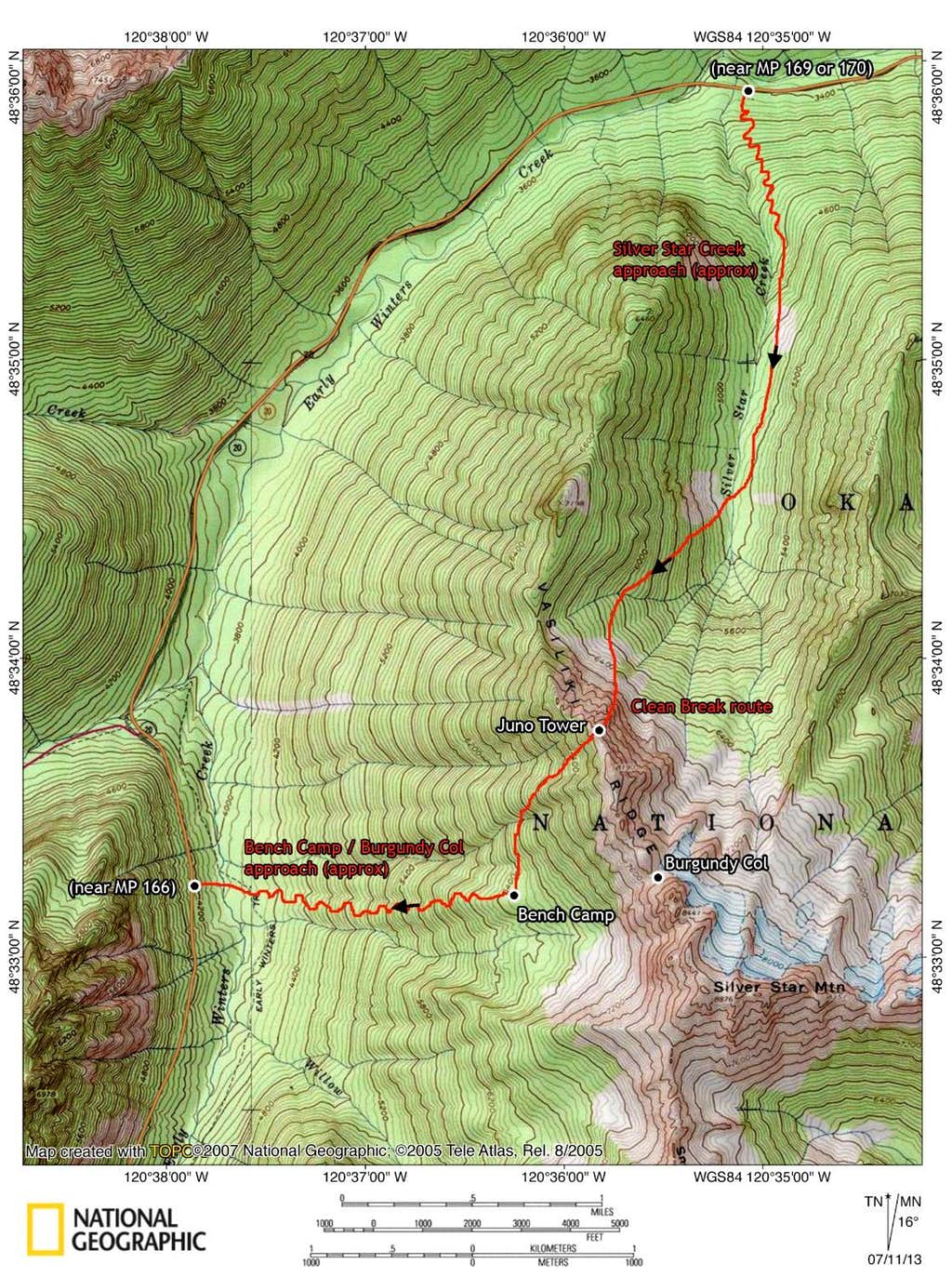 We approached the route via the Silver Star Creek approach, which starts from the small pullout at Silver Star Creek just 8.5 miles east of Washington Pass. There is a good climbers trail that follows along the east side of the creek for a couple of miles before crossing the creek and then ascending talus and forest on the western edge of the valley towards the base of Juno Tower. In this photo, the headwaters of Silver Star Creek are located at the lower left corner and Juno Tower (blocked from view by the hillside) is part of the group of sunlit spires on the right.