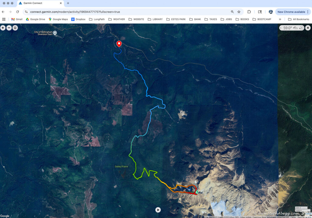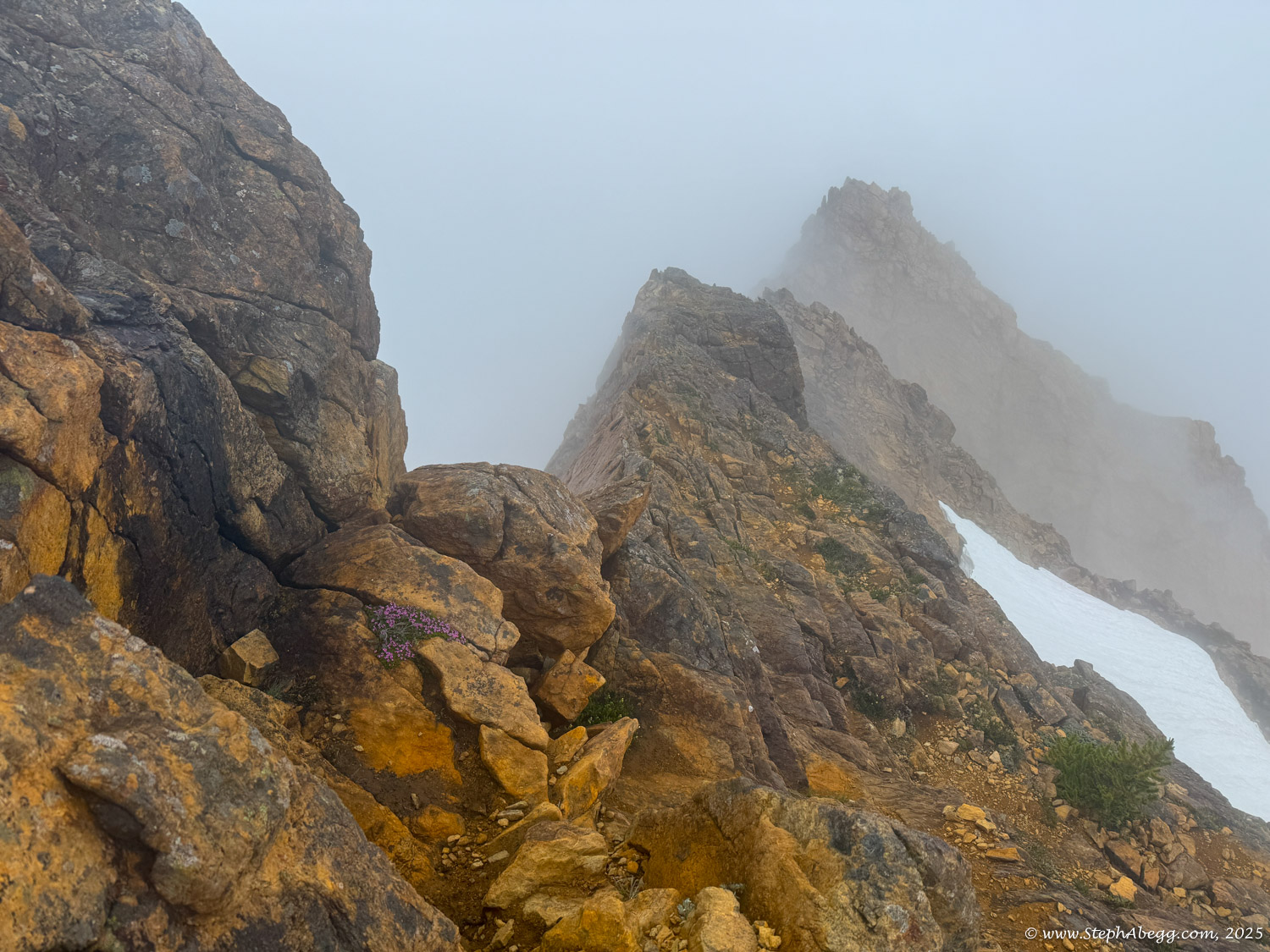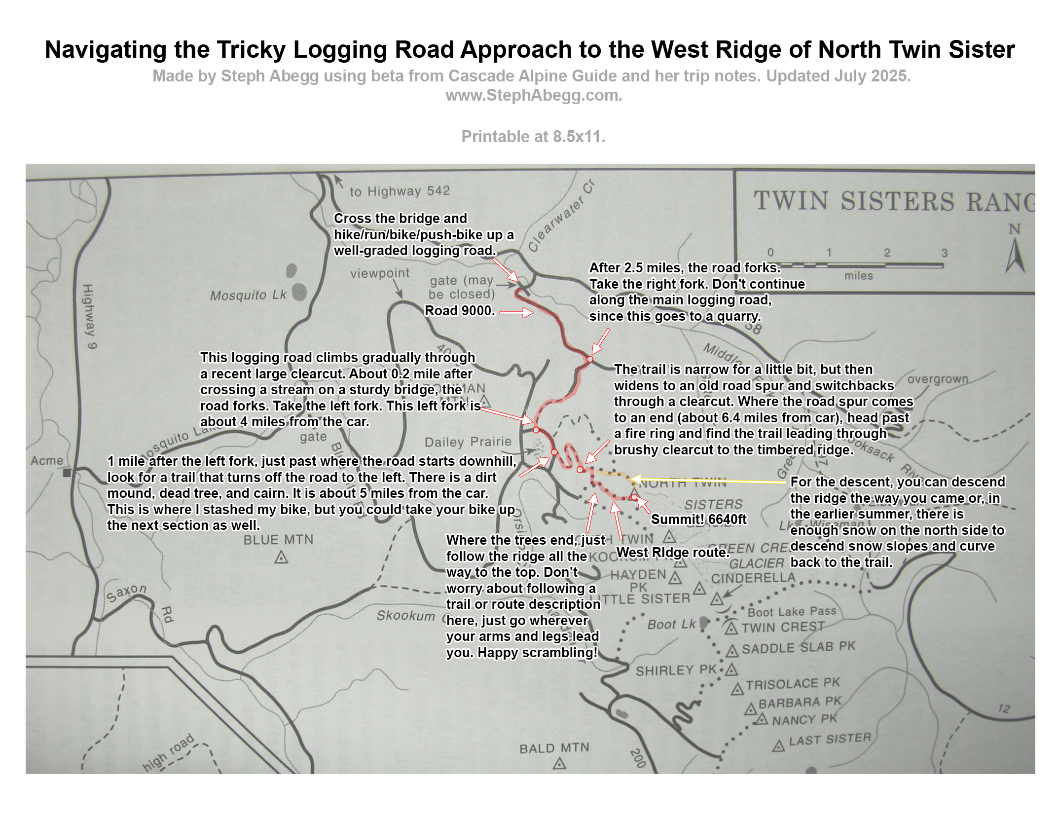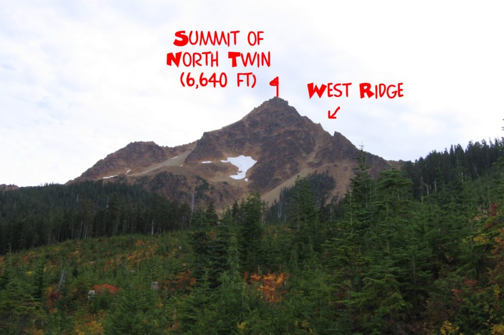 North Twin is the second-highest peak in the rugged Twin Sisters Range, located about 9 miles southwest of the glaciated giant, Mount Baker. On a clear day, the summit offers an unobstructed view of the nearby volcano—but what truly sets it apart is the exceptional quality of the scrambling. The range is composed of dunite, a rare ultramafic rock made almost entirely of olivine. From a climbing perspective, this coarse-grained rock is incredibly grippy—almost like natural sandpaper. North Twin boasts roughly 1,500 vertical feet of sustained Class 3 scrambling on this solid, textured rock. The only drawback is the moderately long approach, made more tedious by the closure of the old logging road. It is nearly 5,500 vertical feel from where you park your car to the summit. Currently, the most efficient option is to bike in—the 5+ miles and 2,500+ vertical feet of uphill riding is a serious grunt, but the bike down is much quicker than hiking.