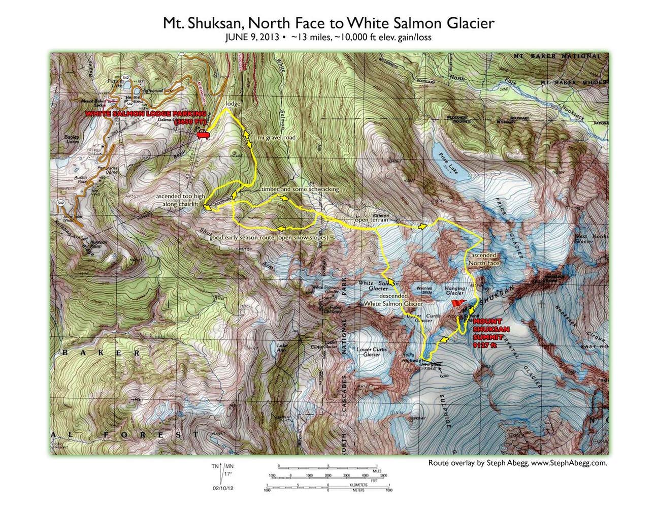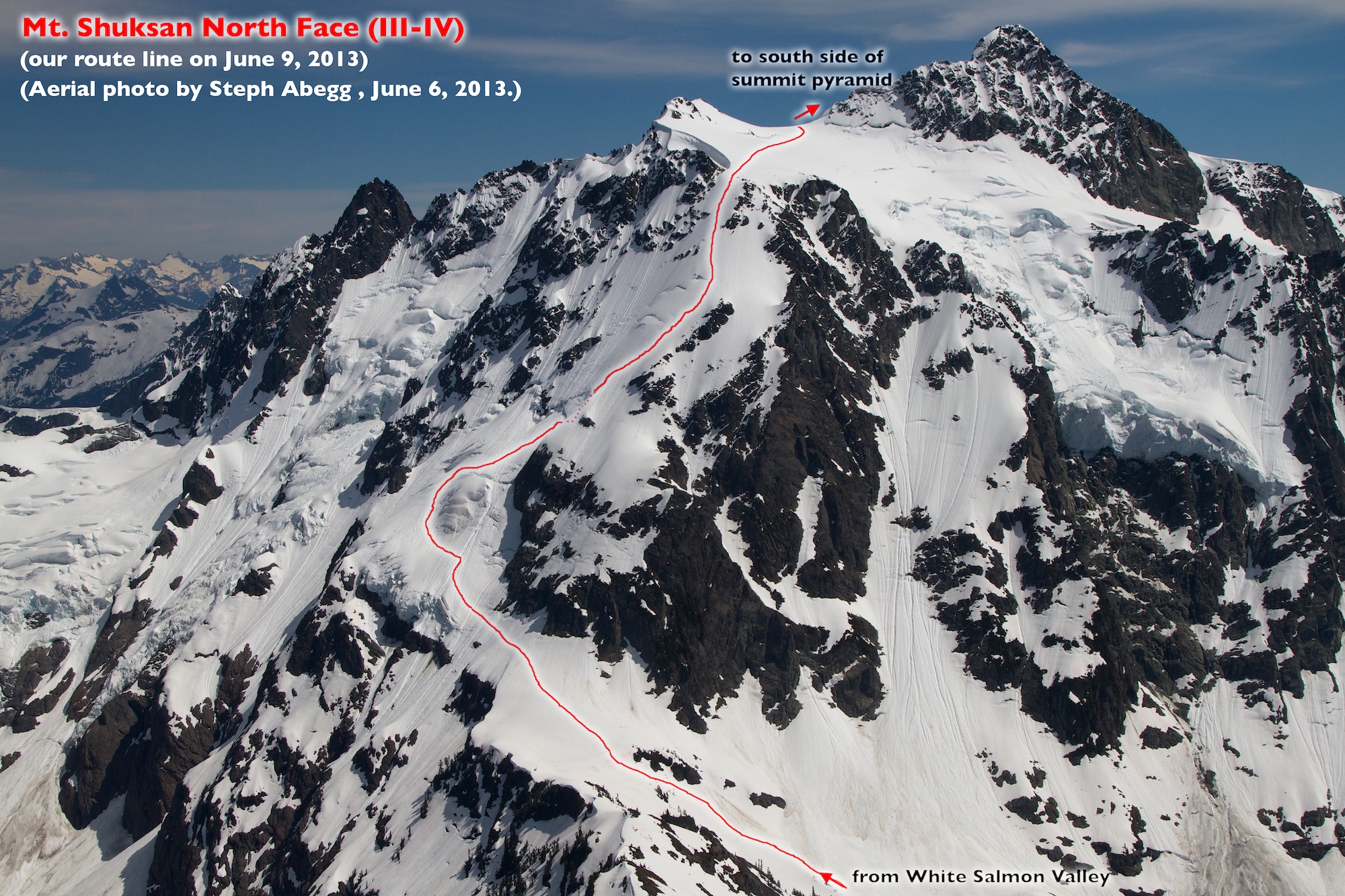 [The North Face of Mt. Shuksan] is a serious snow-and-ice route of moderate steepness on one of the most beautiful mountains in the Cascades. No route on Mount Shuksan is more dramatic than the seldom-done North Face, which ascends the snow- and glacier-clad shoulder dividing the White Salmon cirque from the Price Glacier cirque. The North Face route offers the classic Mount Shuksan challenges: approach difficulties through a valley choked with slide alder, problems with routefinding on the complex peak, and the physical demands resulting from the sheer size of the mountain. But it is a rewarding and direct route to the summit with a satisfying feeling of openness and exposure, a sublime setting, and a view down to Price Lake, milky with glacier slit. The climbing is 40- to 50- degree snow and ice. As with all such routes, snow conditios can be a major variable. Good snow (cold and hard) makes for a pleasant and enjoyable climb, while soft snow can make for a terrifying and possibly dangerous experience. Any climb of Mount Shuksan can be considered strenuous.