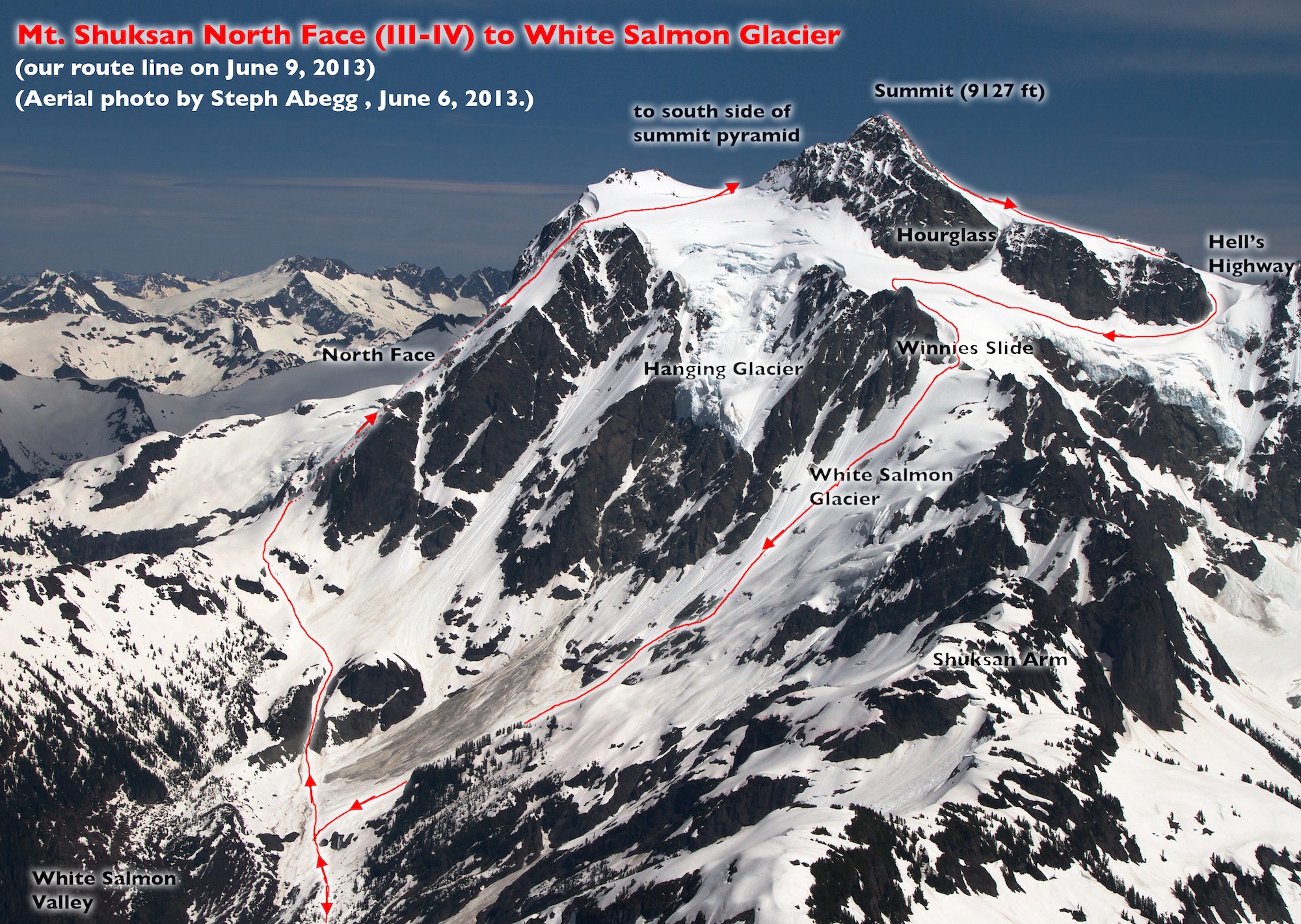 On June 6 (three days before our climb), I joined pilot/aerial photographer John Scurlock to do some aerial photography of a recent landslide at the toe of the Deming Glacier on Mount Baker. Before heading back down to the ground, we did a loop around Mt. Shuksan. I took some close-up photos of the North Face route, shown below. The route looked to be in great shape*, boding well for our plans to climb it a few days later. *Every year is different, the route may be in great shape or quite dangerous in late spring, depending on conditions.
