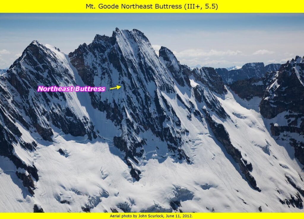 Route overlay of the Northeast Buttress of Goode, on a John Scurlock aerial photo from June 2012.