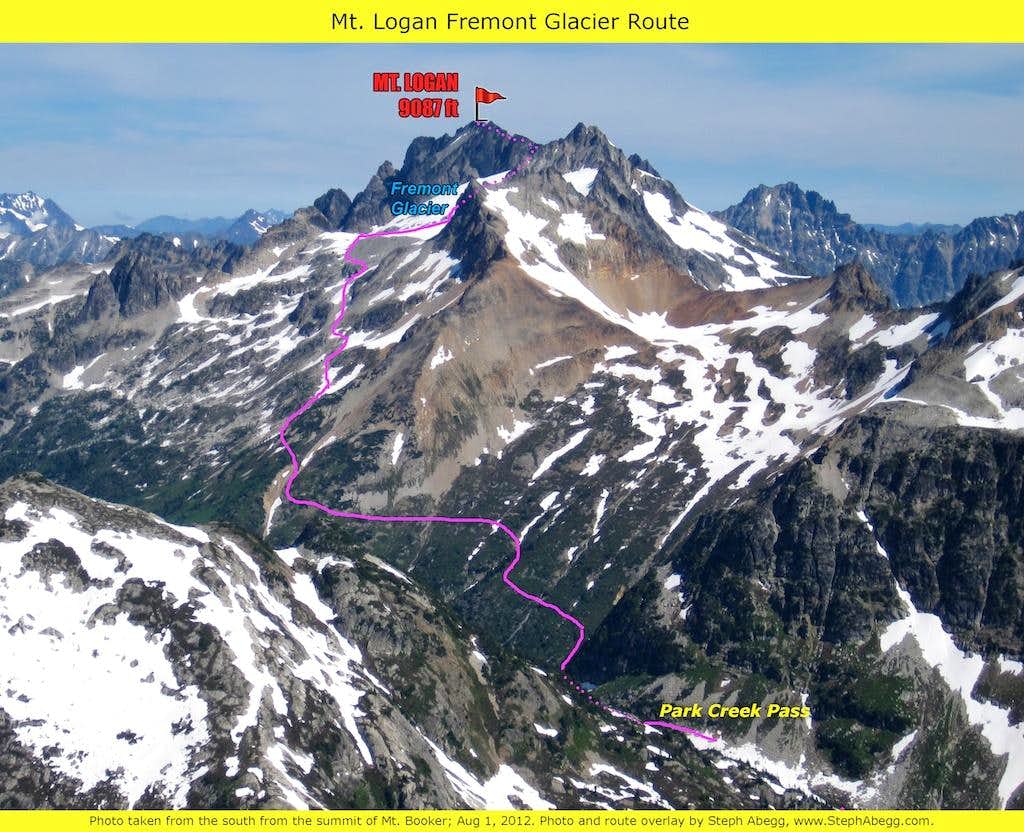 Nelson's description: "From the pass, descend the Thunder Creek Trail north for approximately 0.4 mile to a rocky flat with a small stream. Look for a climbers track leading out of the flat. Traverse northeast, crossing a broad, sandy gully at 6,900 ft approximately 1 mile from the pass. Continue traversing northeast towards the sharp, rocky point at 7760+ feet. Turn right, uphill, before reaching this peak. Ascend talus or snow to the Fremont Glacier (8000 ft), approximately 2 miles from Park Creek Pass."