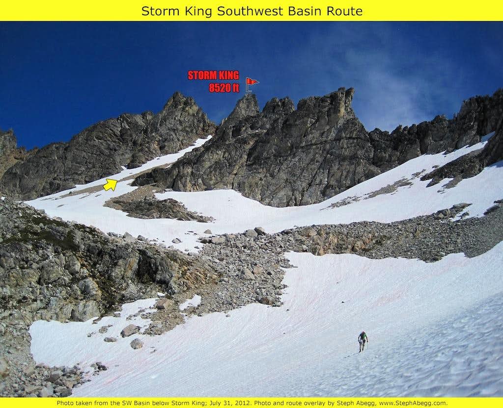 A route overlay showing the general direction of the standard SW basin route up Storm King.