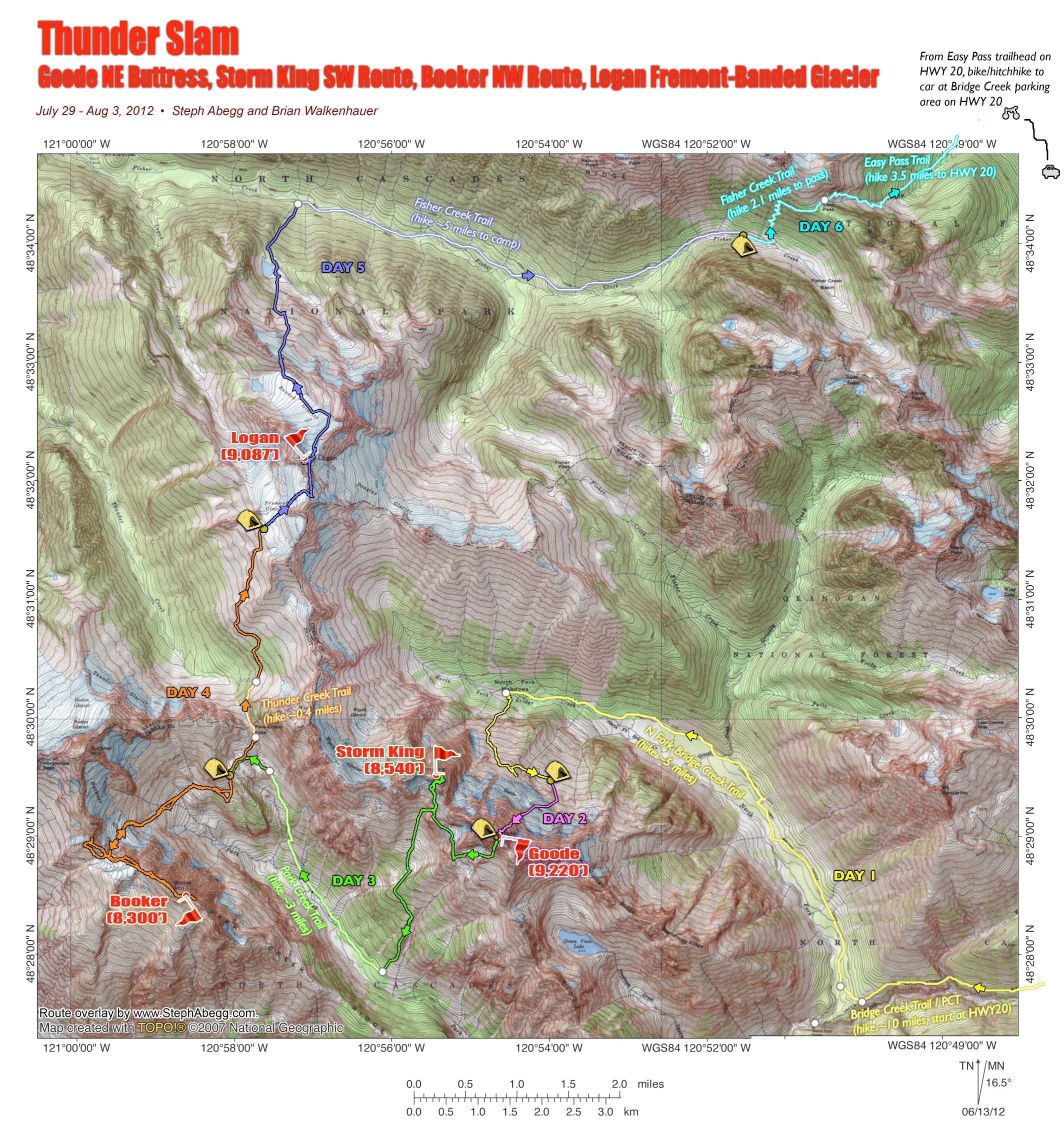 Back in February, Brian and I started to plan a multi-day climbing adventure in the North Cascades for the summer ahead. Two of our favored options were the Chilliwack Group area (Redoubt, Spickard, Mox, etc.) and the Thunder-Bridge-Park Creek area (Goode, Storm King, Logan, etc.). We couldn't decide. So we came up with a good solution: do both!