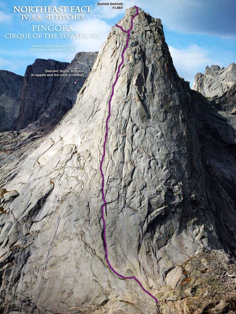 It took us 20 hours to drive to Big Sandy Opening, which is the closest trailhead to the Cirque of the Towers, being an easy 9 mile hike in. We hiked into the Cirque and established a base camp on Sept 2. We planned on having three days to climb, during which we wanted to climb the two Fifty Classic routes in the cirque: (1) the East ridge of Wolf’s Head, and (2) the NE Face of Pingora. Weather permitting, we would climb more.