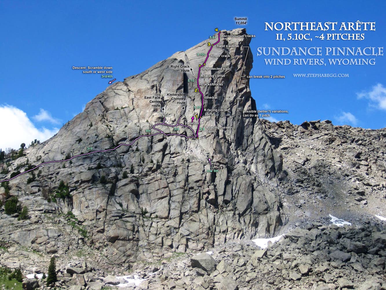 (Climb 2:) Northeast Face (IV, 5.8, ~11 pitches) of PINGORA, a Fifty Crowded Classic that features sustained and fun crack systems and is a must-do climb of the area. Despite arriving at the base of the route to discover three parties already queued for the second pitch, we were on top of Pingora in just over three hours. This gave us plenty of time to pack up and move camp to below the base of the southeast side of Warbonnet, where we could sit and stare at the next day's objective: