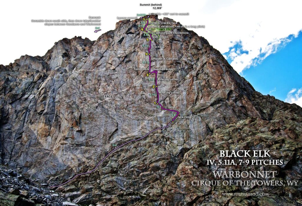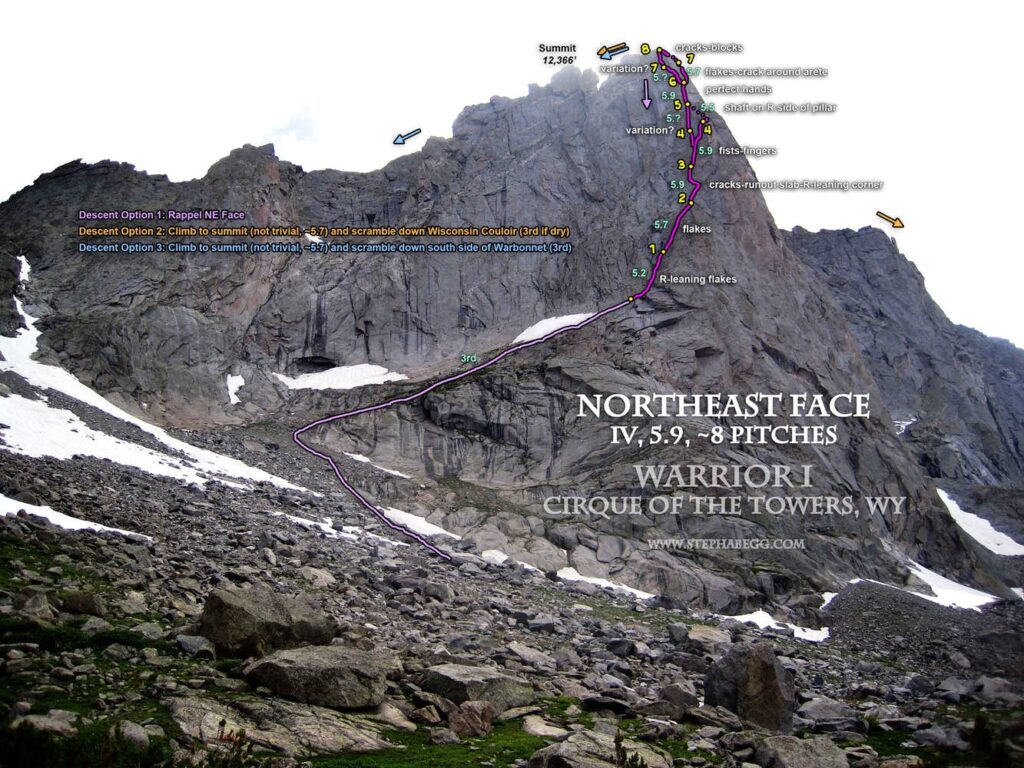 (Climb 1:) Northeast Face (IV, 5.9, ~8 pitches) of WARRIOR I as our first climb of the trip. This turned out to be a good choice — a nice 5.9 warm-up with enough route-finding challenges to make it a non-trivial undertaking. The key with this route is to stay on route and then it's a great climb. For our second climb of the trip, we decided it logistically made sense to choose a route in the Cirque before moving camp and tackling Black Elk. We tossed around the idea of climbing Feather Buttress on Warbonnet, but ultimately decided against it due to our lack of route beta and the shady aspect of the route (temperatures were cold in the shade, especially if windy). Since Dow had never been to the Cirque, we decided to run up the