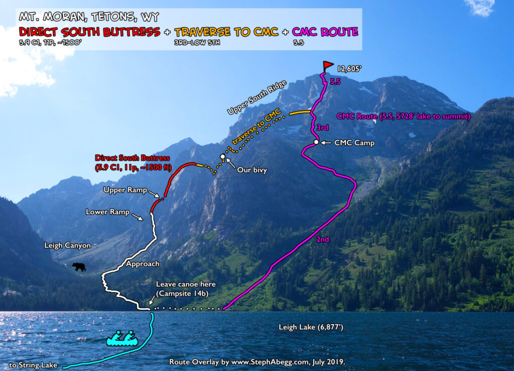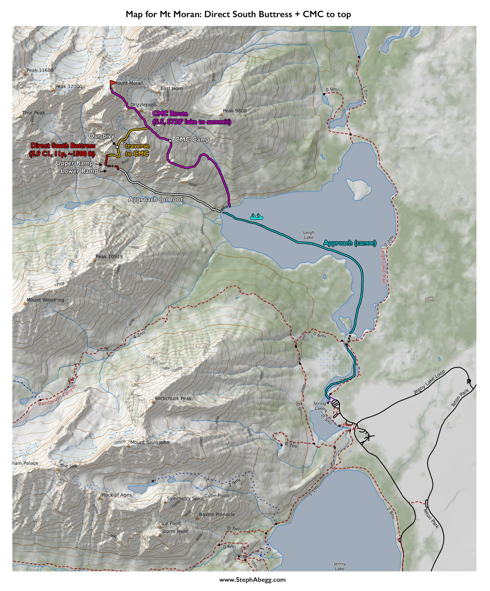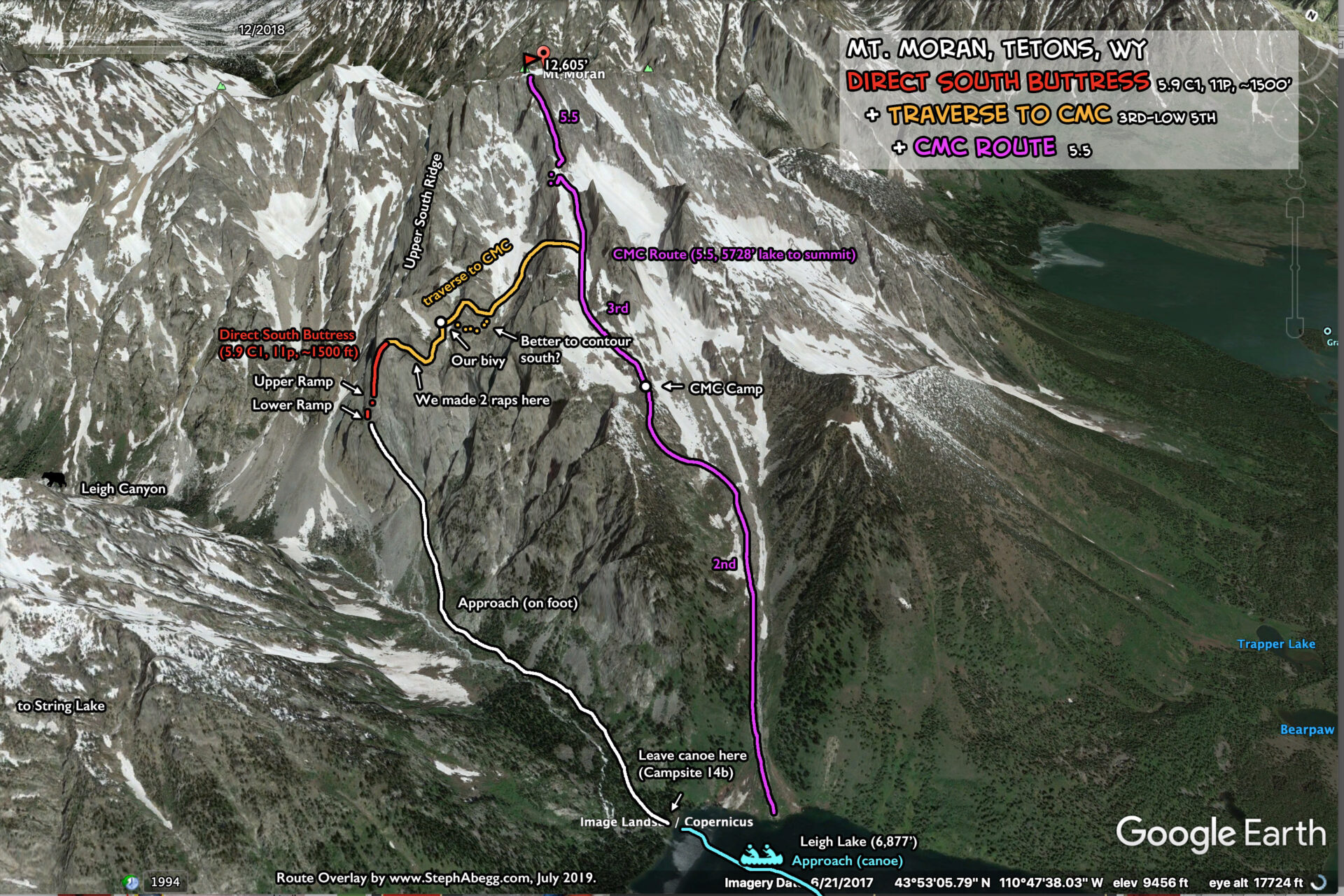 | 41. Looking up towards the Upper South Ridge. 42. Looking east. The start of our traverse towards the CMC Route involved hiking across this treed bowl. 43. Starting across the bowl. 44. A bivy site in the grove of trees. But no water. 45. Rappelling to easier ground. (Photo by Will.) 46. Scrambling. 47. We found an awesome bivy site in a grove of trees, with water about 100 feet away. 48. In addition to the stove, my luxury item was a solar light cube. Will's luxury item was a pillow. All of our luxury items were worth it. 49. Location of our bivy is at the orange arrow. Ignore the purple track. 50. View out from our bivy. Leigh Lake below. (Photo by Will.) 51. The next morning, we ascended this gully a bit since we thought the notch on the right looked promising. 52. A short section of 5th class in the gully we roped up for. I think this could have been avoided had we contoured around the rock buttress instead of going up this gully (see my Google Earth overlay). 53. Scrambling up towards the notch. 54. Rappelling the other side. In retrospect, I am pretty sure we could have just contoured around the end of this rock buttress and avoided both the 5th class step and the rappel (see my Google Earth overlay). (Photo by Will.) 55. We scrambled across this broad gully to the low point in the ridge on the right. This must be the long south ridge of the Drizzlepuss feature, since we intersected the CMC Route on the other side of the notch. 56. We didn't see any mountain goats, but there must be some goats living high on Moran. 57. View back from the notch. |